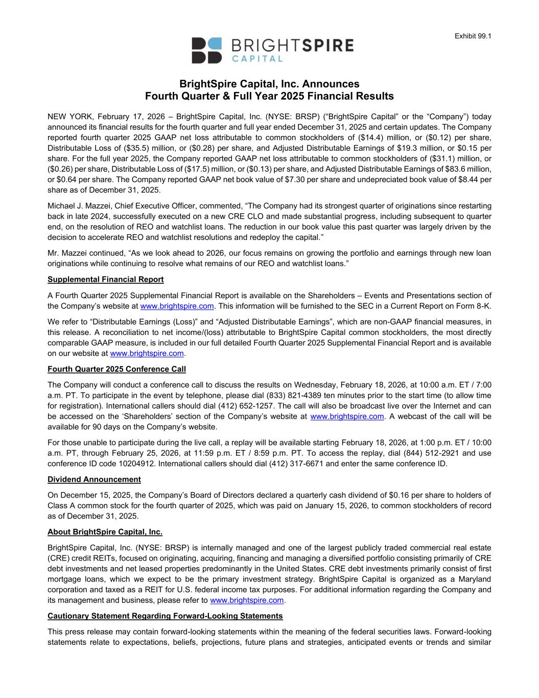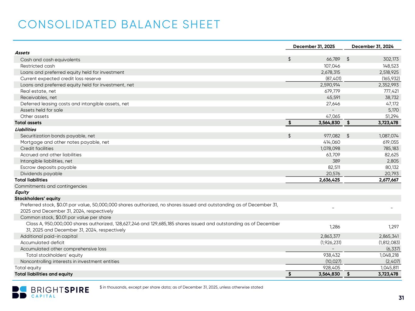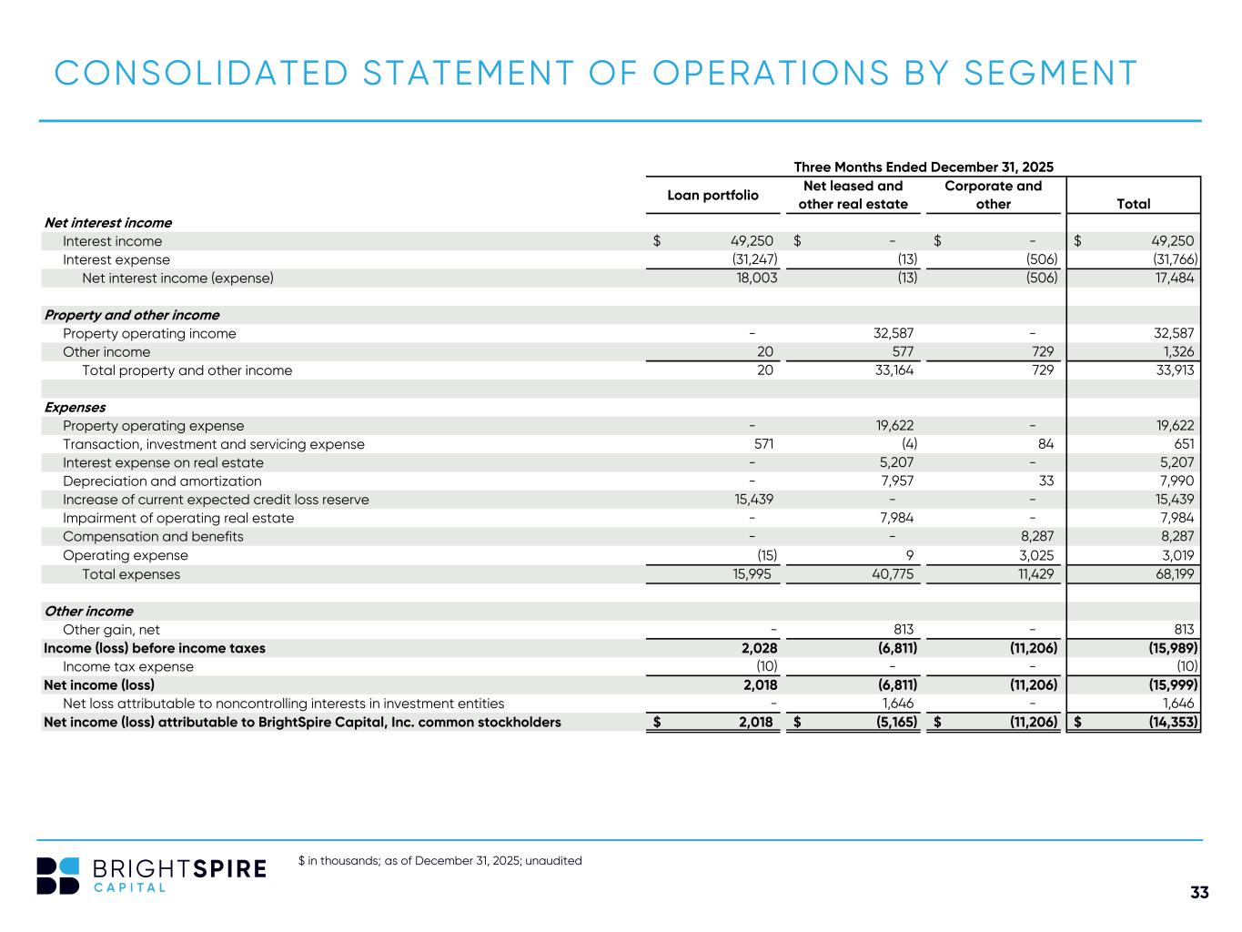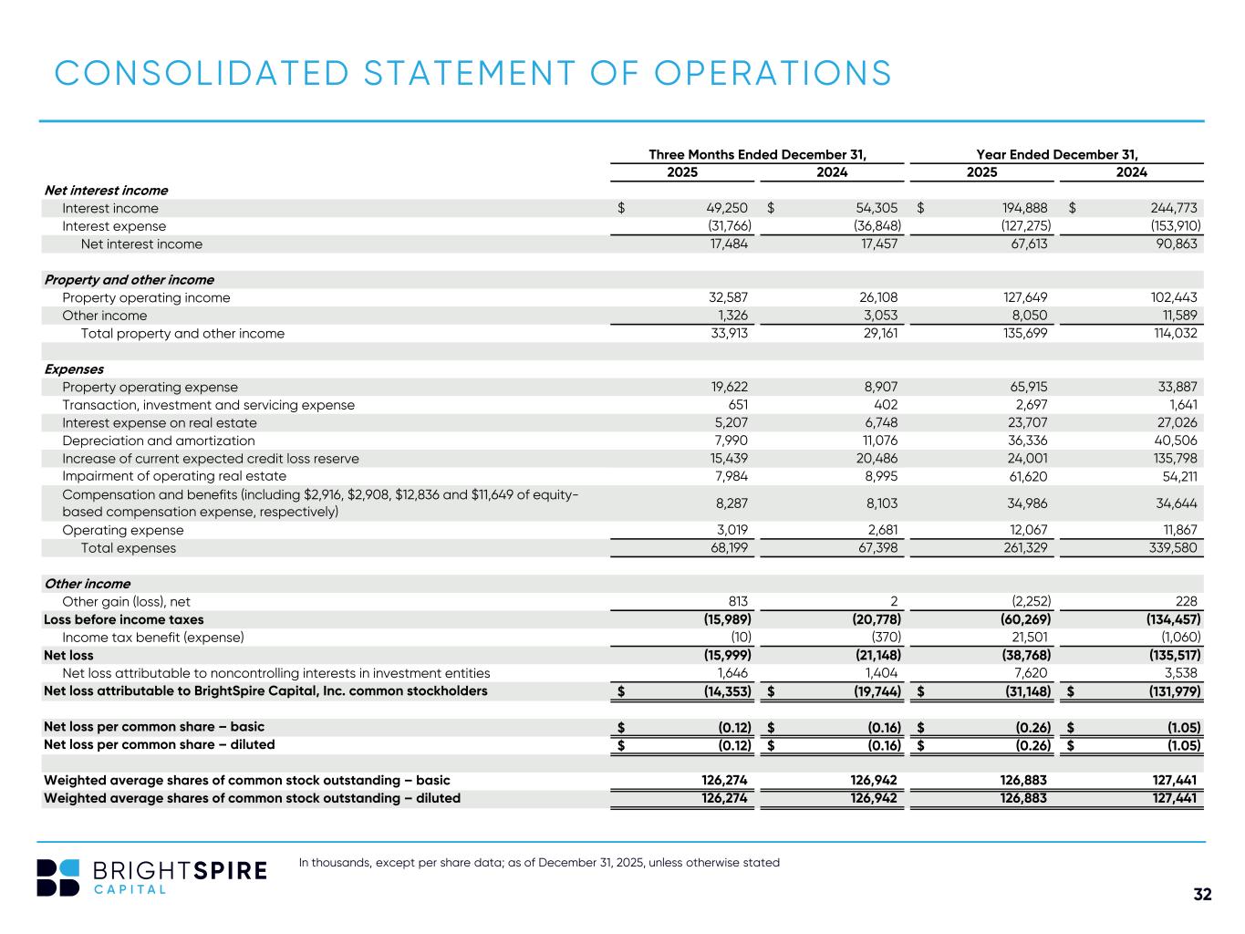 32 In thousands, except per share data; as of December 31, 2025, unless otherwise stated CONSOLIDATED STATEMENT OF OPERATIONS Three Months Ended December 31, Year Ended December 31, 2025 2024 2025 2024 Net interest income Interest income 49,250$ 54,305$ 194,888$ 244,773$ Interest expense (31,766) (36,848) (127,275) (153,910) Net interest income 17,484 17,457 67,613 90,863 Property and other income Property operating income 32,587 26,108 127,649 102,443 Other income 1,326 3,053 8,050 11,589 Total property and other income 33,913 29,161 135,699 114,032 Expenses Property operating expense 19,622 8,907 65,915 33,887 Transaction, investment and servicing expense 651 402 2,697 1,641 Interest expense on real estate 5,207 6,748 23,707 27,026 Depreciation and amortization 7,990 11,076 36,336 40,506 Increase of current expected credit loss reserve 15,439 20,486 24,001 135,798 Impairment of operating real estate 7,984 8,995 61,620 54,211 Compensation and benefits (including $2,916, $2,908, $12,836 and $11,649 of equity- based compensation expense, respectively) 8,287 8,103 34,986 34,644 Operating expense 3,019 2,681 12,067 11,867 Total expenses 68,199 67,398 261,329 339,580 Other income Other gain (loss), net 813 2 (2,252) 228 Loss before income taxes (15,989) (20,778) (60,269) (134,457) Income tax benefit (expense) (10) (370) 21,501 (1,060) Net loss (15,999) (21,148) (38,768) (135,517) Net loss attributable to noncontrolling interests in investment entities 1,646 1,404 7,620 3,538 Net loss attributable to BrightSpire Capital, Inc. common stockholders (14,353)$ (19,744)$ (31,148)$ (131,979)$ Net loss per common share – basic (0.12)$ (0.16)$ (0.26)$ (1.05)$ Net loss per common share – diluted (0.12)$ (0.16)$ (0.26)$ (1.05)$ Weighted average shares of common stock outstanding – basic 126,274 126,942 126,883 127,441 Weighted average shares of common stock outstanding – diluted 126,274 126,942 126,883 127,441
