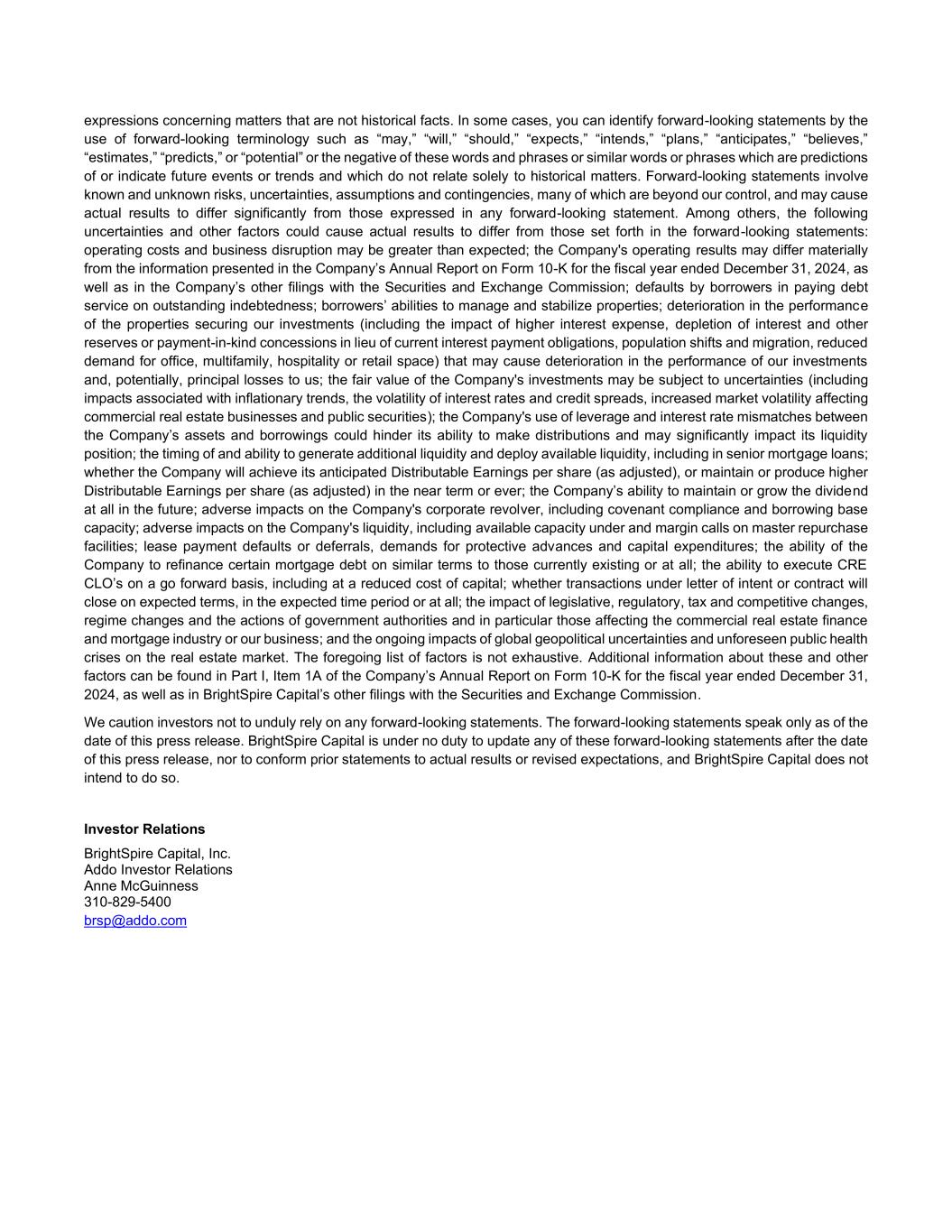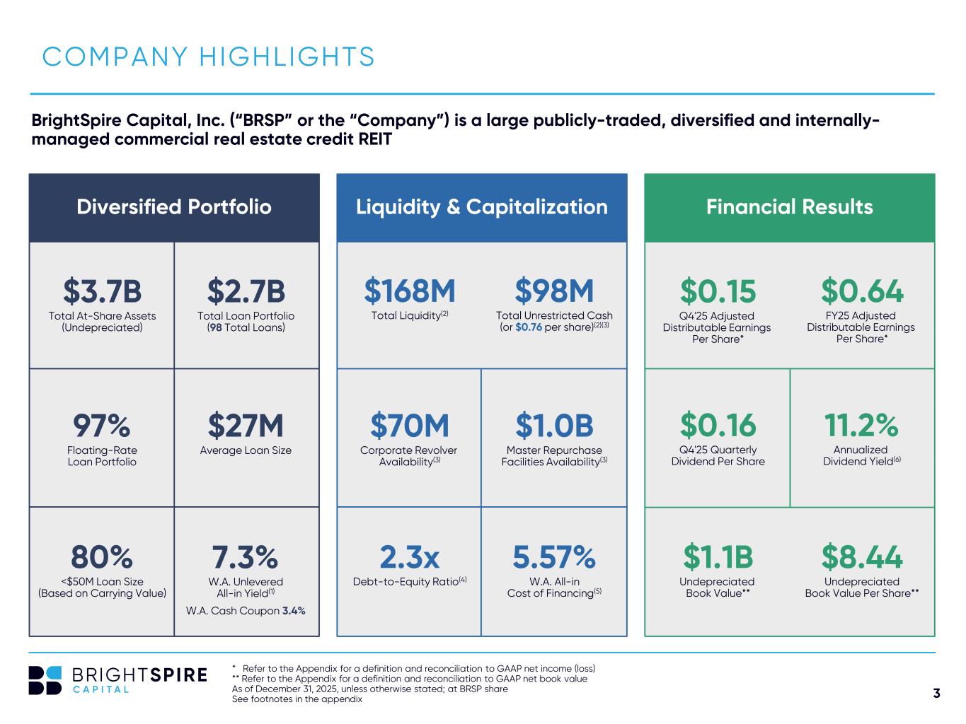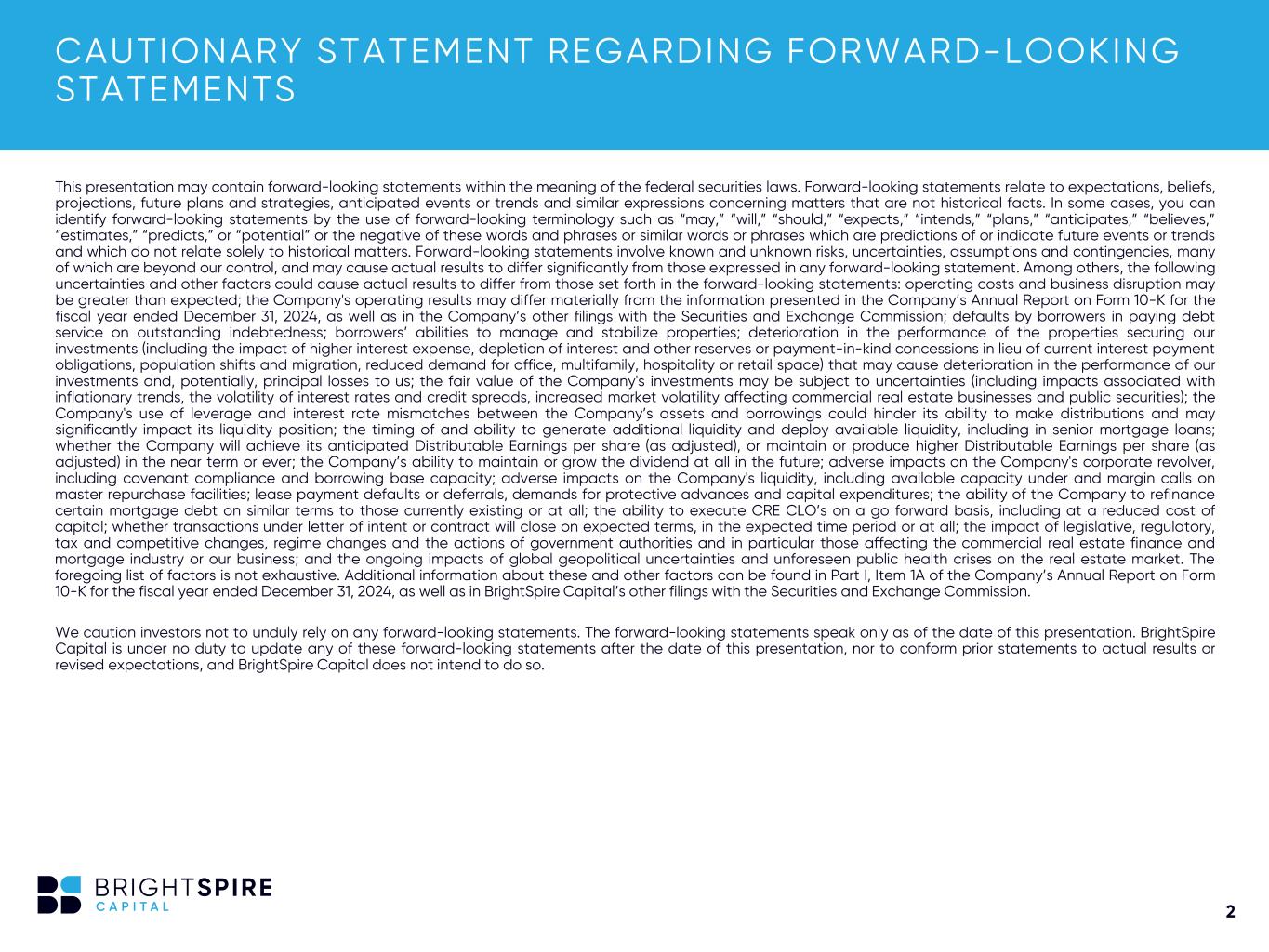2 CAUTIONARY STATEMENT REGARDING FORWARD-LOOKING STATEMENTS This presentation may contain forward-looking statements within the meaning of the federal securities laws. Forward-looking statements relate to expectations, beliefs, projections, future plans and strategies, anticipated events or trends and similar expressions concerning matters that are not historical facts. In some cases, you can identify forward-looking statements by the use of forward-looking terminology such as “may,” “will,” “should,” “expects,” “intends,” “plans,” “anticipates,” “believes,” “estimates,” “predicts,” or “potential” or the negative of these words and phrases or similar words or phrases which are predictions of or indicate future events or trends and which do not relate solely to historical matters. Forward-looking statements involve known and unknown risks, uncertainties, assumptions and contingencies, many of which are beyond our control, and may cause actual results to differ significantly from those expressed in any forward-looking statement. Among others, the following uncertainties and other factors could cause actual results to differ from those set forth in the forward-looking statements: operating costs and business disruption may be greater than expected; the Company's operating results may differ materially from the information presented in the Company’s Annual Report on Form 10-K for the fiscal year ended December 31, 2024, as well as in the Company’s other filings with the Securities and Exchange Commission; defaults by borrowers in paying debt service on outstanding indebtedness; borrowers’ abilities to manage and stabilize properties; deterioration in the performance of the properties securing our investments (including the impact of higher interest expense, depletion of interest and other reserves or payment-in-kind concessions in lieu of current interest payment obligations, population shifts and migration, reduced demand for office, multifamily, hospitality or retail space) that may cause deterioration in the performance of our investments and, potentially, principal losses to us; the fair value of the Company's investments may be subject to uncertainties (including impacts associated with inflationary trends, the volatility of interest rates and credit spreads, increased market volatility affecting commercial real estate businesses and public securities); the Company's use of leverage and interest rate mismatches between the Company’s assets and borrowings could hinder its ability to make distributions and may significantly impact its liquidity position; the timing of and ability to generate additional liquidity and deploy available liquidity, including in senior mortgage loans; whether the Company will achieve its anticipated Distributable Earnings per share (as adjusted), or maintain or produce higher Distributable Earnings per share (as adjusted) in the near term or ever; the Company’s ability to maintain or grow the dividend at all in the future; adverse impacts on the Company's corporate revolver, including covenant compliance and borrowing base capacity; adverse impacts on the Company's liquidity, including available capacity under and margin calls on master repurchase facilities; lease payment defaults or deferrals, demands for protective advances and capital expenditures; the ability of the Company to refinance certain mortgage debt on similar terms to those currently existing or at all; the ability to execute CRE CLO’s on a go forward basis, including at a reduced cost of capital; whether transactions under letter of intent or contract will close on expected terms, in the expected time period or at all; the impact of legislative, regulatory, tax and competitive changes, regime changes and the actions of government authorities and in particular those affecting the commercial real estate finance and mortgage industry or our business; and the ongoing impacts of global geopolitical uncertainties and unforeseen public health crises on the real estate market. The foregoing list of factors is not exhaustive. Additional information about these and other factors can be found in Part I, Item 1A of the Company’s Annual Report on Form 10-K for the fiscal year ended December 31, 2024, as well as in BrightSpire Capital’s other filings with the Securities and Exchange Commission. We caution investors not to unduly rely on any forward-looking statements. The forward-looking statements speak only as of the date of this presentation. BrightSpire Capital is under no duty to update any of these forward-looking statements after the date of this presentation, nor to conform prior statements to actual results or revised expectations, and BrightSpire Capital does not intend to do so.