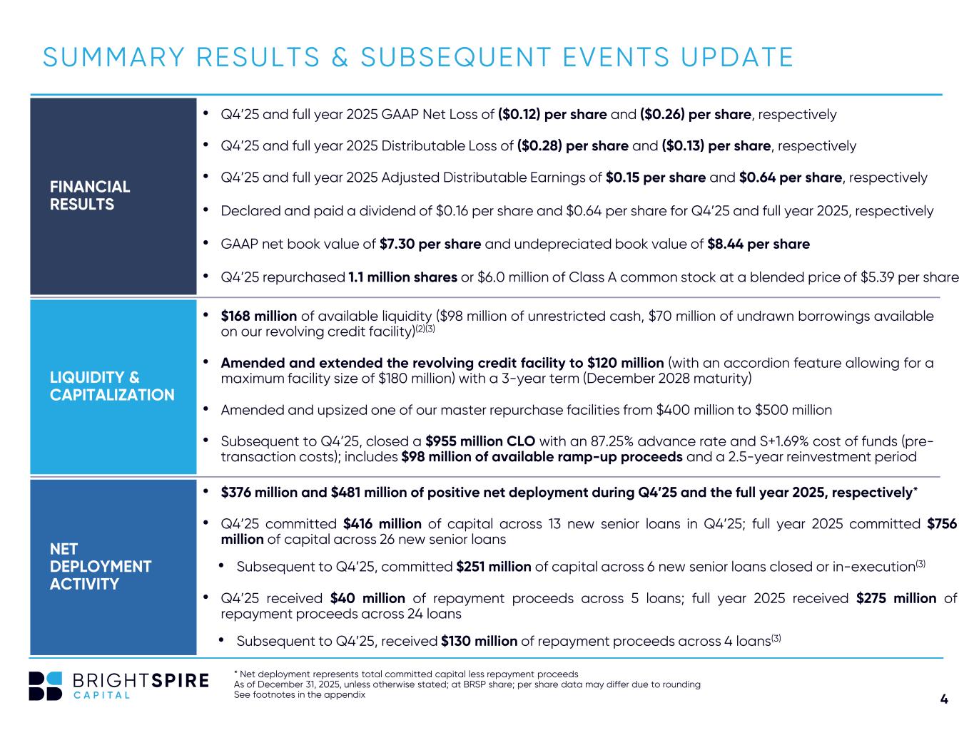3 Diversified Portfolio Liquidity & Capitalization Financial Results $3.7B Total At-Share Assets (Undepreciated) * Refer to the Appendix for a definition and reconciliation to GAAP net income (loss) ** Refer to the Appendix for a definition and reconciliation to GAAP net book value As of December 31, 2025, unless otherwise stated; at BRSP share See footnotes in the appendix COMPANY HIGHLIGHTS BrightSpire Capital, Inc. (“BRSP” or the “Company”) is a large publicly-traded, diversified and internally- managed commercial real estate credit REIT $2.7B Total Loan Portfolio (98 Total Loans) $27M Average Loan Size 97% Floating-Rate Loan Portfolio $168M Total Liquidity(2) $98M Total Unrestricted Cash (or $0.76 per share)(2)(3) $70M Corporate Revolver Availability(3) 2.3x Debt-to-Equity Ratio(4) 5.57% W.A. All-in Cost of Financing(5) $1.0B Master Repurchase Facilities Availability(3) 7.3% W.A. Unlevered All-in Yield(1) W.A. Cash Coupon 3.4% 80% <$50M Loan Size (Based on Carrying Value) $0.15 Q4'25 Adjusted Distributable Earnings Per Share* $0.16 Q4'25 Quarterly Dividend Per Share 11.2% Annualized Dividend Yield(6) $1.1B Undepreciated Book Value** $8.44 Undepreciated Book Value Per Share** $0.64 FY25 Adjusted Distributable Earnings Per Share*