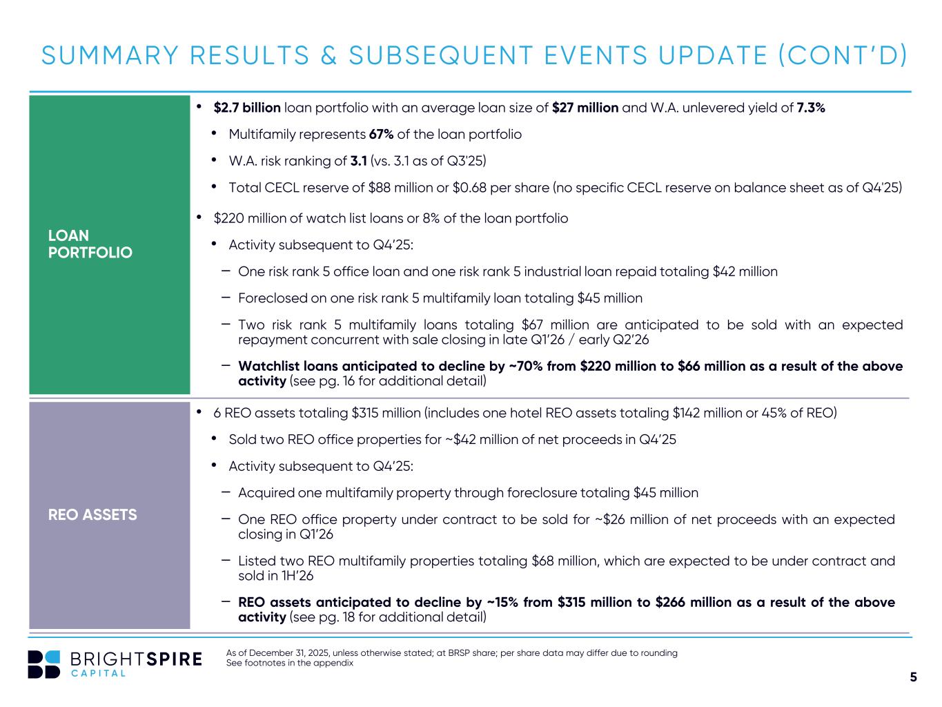 4 SUMMARY RESULTS & SUBSEQUENT EVENTS UPDATE NET DEPLOYMENT ACTIVITY FINANCIAL RESULTS LIQUIDITY & CAPITALIZATION * Net deployment represents total committed capital less repayment proceeds As of December 31, 2025, unless otherwise stated; at BRSP share; per share data may differ due to rounding See footnotes in the appendix • $168 million of available liquidity ($98 million of unrestricted cash, $70 million of undrawn borrowings available on our revolving credit facility)(2)(3) • Amended and extended the revolving credit facility to $120 million (with an accordion feature allowing for a maximum facility size of $180 million) with a 3-year term (December 2028 maturity) • Amended and upsized one of our master repurchase facilities from $400 million to $500 million • Subsequent to Q4’25, closed a $955 million CLO with an 87.25% advance rate and S+1.69% cost of funds (pre- transaction costs); includes $98 million of available ramp-up proceeds and a 2.5-year reinvestment period • Q4’25 and full year 2025 GAAP Net Loss of ($0.12) per share and ($0.26) per share, respectively • Q4’25 and full year 2025 Distributable Loss of ($0.28) per share and ($0.13) per share, respectively • Q4’25 and full year 2025 Adjusted Distributable Earnings of $0.15 per share and $0.64 per share, respectively • Declared and paid a dividend of $0.16 per share and $0.64 per share for Q4’25 and full year 2025, respectively • GAAP net book value of $7.30 per share and undepreciated book value of $8.44 per share • Q4’25 repurchased 1.1 million shares or $6.0 million of Class A common stock at a blended price of $5.39 per share • $376 million and $481 million of positive net deployment during Q4’25 and the full year 2025, respectively* • Q4’25 committed $416 million of capital across 13 new senior loans in Q4’25; full year 2025 committed $756 million of capital across 26 new senior loans • Subsequent to Q4’25, committed $251 million of capital across 6 new senior loans closed or in-execution(3) • Q4’25 received $40 million of repayment proceeds across 5 loans; full year 2025 received $275 million of repayment proceeds across 24 loans • Subsequent to Q4’25, received $130 million of repayment proceeds across 4 loans(3)