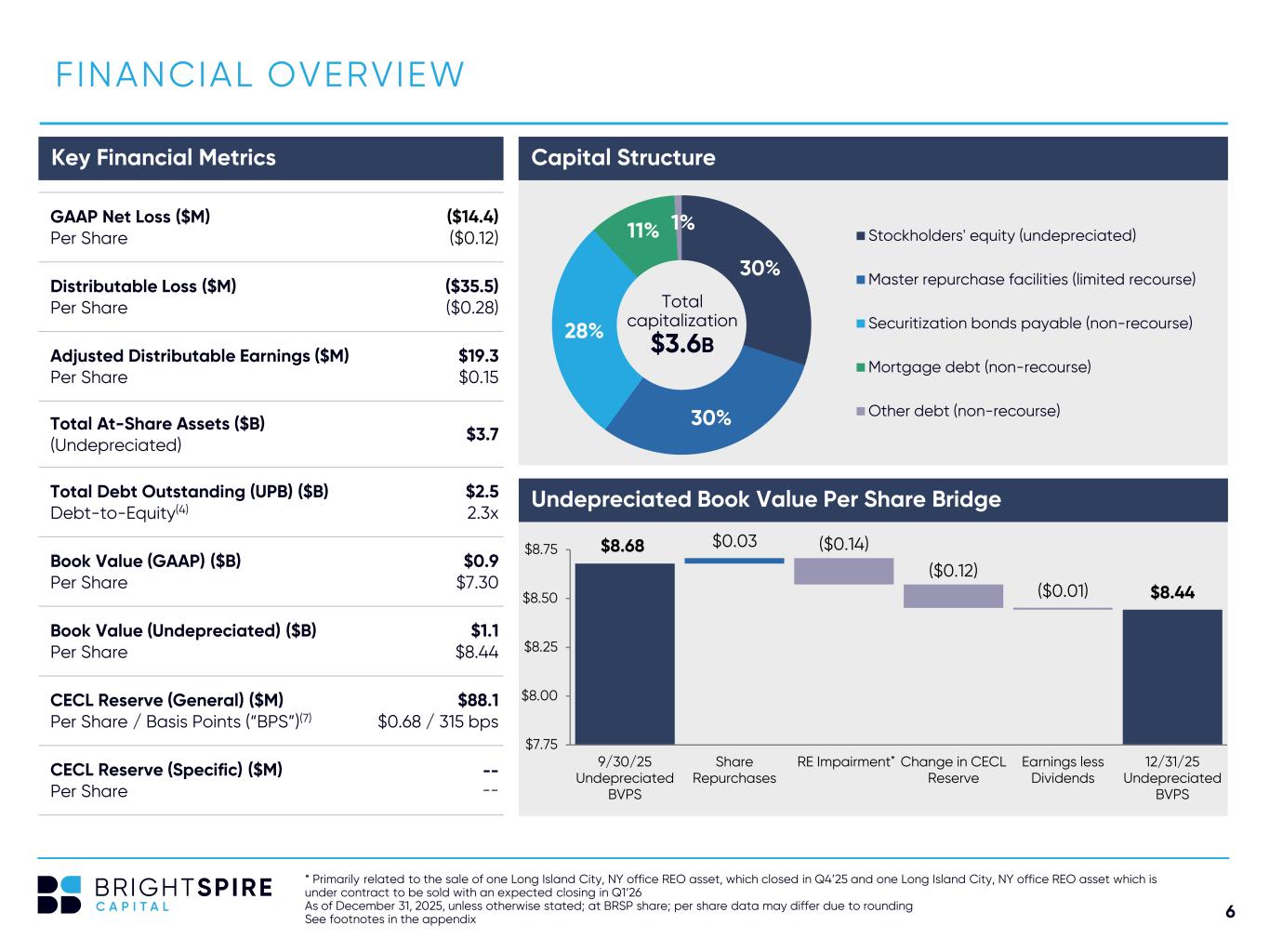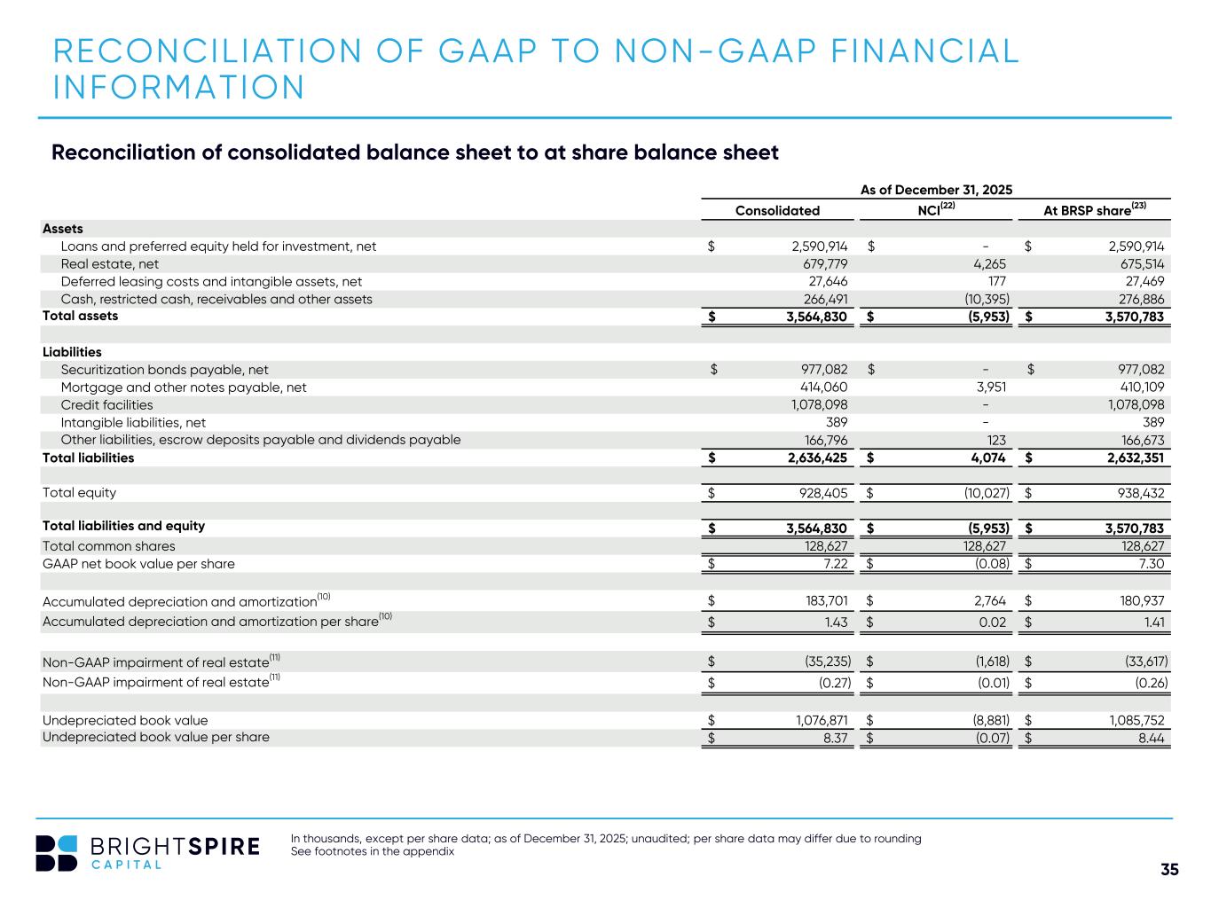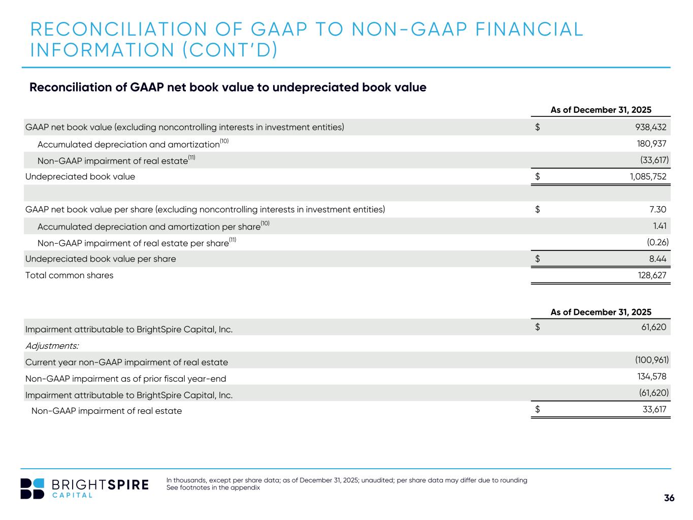 35 Reconciliation of consolidated balance sheet to at share balance sheet In thousands, except per share data; as of December 31, 2025; unaudited; per share data may differ due to rounding See footnotes in the appendix RECONCILIATION OF GAAP TO NON-GAAP FINANCIAL INFORMATION As of December 31, 2025 Consolidated NCI(22) At BRSP share(23) Assets Loans and preferred equity held for investment, net 2,590,914$ -$ 2,590,914$ Real estate, net 679,779 4,265 675,514 Deferred leasing costs and intangible assets, net 27,646 177 27,469 Cash, restricted cash, receivables and other assets 266,491 (10,395) 276,886 Total assets 3,564,830$ (5,953)$ 3,570,783$ Liabilities Securitization bonds payable, net 977,082$ -$ 977,082$ Mortgage and other notes payable, net 414,060 3,951 410,109 Credit facilities 1,078,098 - 1,078,098 Intangible liabilities, net 389 - 389 Other liabilities, escrow deposits payable and dividends payable 166,796 123 166,673 Total liabilities 2,636,425$ 4,074$ 2,632,351$ Total equity 928,405$ (10,027)$ 938,432$ Total liabilities and equity 3,564,830$ (5,953)$ 3,570,783$ Total common shares 128,627 128,627 128,627 GAAP net book value per share 7.22$ (0.08)$ 7.30$ Accumulated depreciation and amortization(10) 183,701$ 2,764$ 180,937$ Accumulated depreciation and amortization per share(10) 1.43$ 0.02$ 1.41$ Non-GAAP impairment of real estate(11) (35,235)$ (1,618)$ (33,617)$ Non-GAAP impairment of real estate(11) (0.27)$ (0.01)$ (0.26)$ Undepreciated book value 1,076,871$ (8,881)$ 1,085,752$ Undepreciated book value per share 8.37$ (0.07)$ 8.44$
