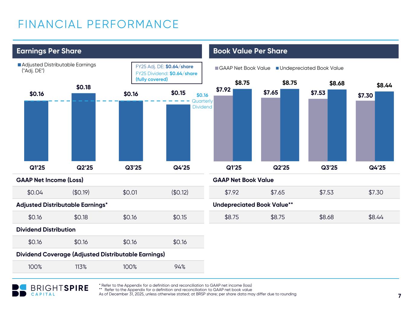 7 $0.16 Quarterly Dividend $0.16 $0.18 $0.16 $0.15 Adjusted Distributable Earnings ("Adj. DE") Earnings Per Share FINANCIAL PERFORMANCE * Refer to the Appendix for a definition and reconciliation to GAAP net income (loss) *** Refer to the Appendix for a definition and reconciliation to GAAP net book value As of December 31, 2025, unless otherwise stated; at BRSP share; per share data may differ due to rounding Book Value Per Share Q1’25 Q2’25 Q3’25 Q4’25 GAAP Net Income (Loss) $0.04 ($0.19) $0.01 ($0.12) Adjusted Distributable Earnings* $0.16 $0.18 $0.16 $0.15 Dividend Distribution $0.16 $0.16 $0.16 $0.16 Dividend Coverage (Adjusted Distributable Earnings) 100% 113% 100% 94% Q1’25 Q2’25 Q3’25 Q4’25 GAAP Net Book Value $7.92 $7.65 $7.53 $7.30 Undepreciated Book Value** $8.75 $8.75 $8.68 $8.44 $7.92 $7.65 $7.53 $7.30 $8.75 $8.75 $8.68 $8.44 GAAP Net Book Value Undepreciated Book ValueFY25 Adj. DE: $0.64/share FY25 Dividend: $0.64/share (fully covered)