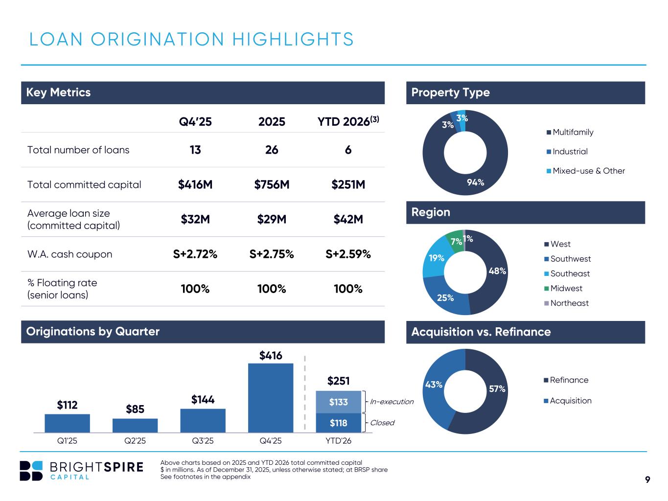 8 (At BRSP share) Investment count Carrying value Net carrying value Per share Loan portfolio 98 2,678$ 727$ 5.66$ General CECL reserves (88) (88) (0.68) Loan portfolio, net of general CECL reserves 98 2,590 639 4.97 Net lease 7 316 31 0.24 Other real estate 7 386 151 1.17 CRE debt securities(8) 1 2 2 0.02 Total investment portfolio 113 3,295$ 823$ 6.40$ Plus: cash & net assets(9) 276 115 0.89 Total - GAAP 3,571$ 938$ 7.30$ Plus: accumulated D&A(10) 181 181 1.41 Less: non-GAAP impariment of real estate(11) (34) (34) (0.26) Total - Undepreciated 3,718$ 1,086$ 8.44$ 80% 20% <1% Loan portfolio Net lease & other real estate CRE debt securities 57% 19% 5% 7% 7% 4% 1%Multifamily Office (loan portfolio) Office (NNN & Other RE) Industrial Mixed-use & Other Hotel Retail Above charts exclude the impact of CECL reserves. In addition, “Property Type” chart excludes CRE debt securities $ in millions, except per share data; as of December 31, 2025; at BRSP share; per share data may differ due to rounding See footnotes in the appendix PORTFOLIO OVERVIEW Based on GAAP net carrying value as of December 31, 2025 Based on GAAP gross carrying value as of December 31, 2025 Investment Type Portfolio Overview (8) Property Type