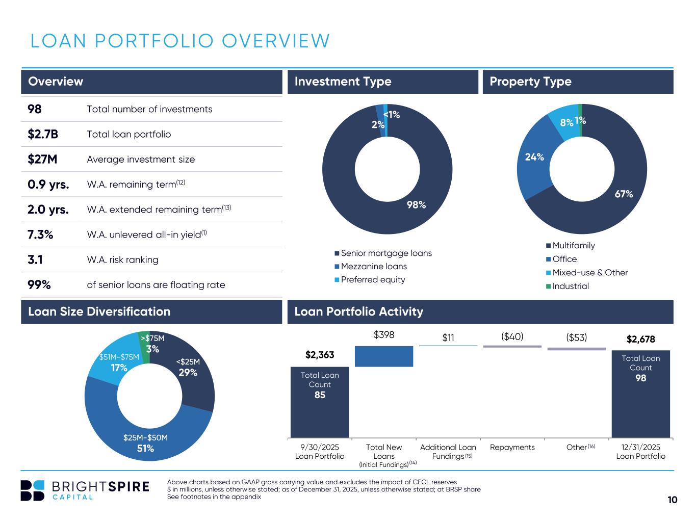 9 LOAN ORIGINATION HIGHLIGHTS Key Metrics B U D G E T V S . A C T U A L Q4’25 2025 YTD 2026(3) Total number of loans 13 26 6 Total committed capital $416M $756M $251M Average loan size (committed capital) $32M $29M $42M W.A. cash coupon S+2.72% S+2.75% S+2.59% % Floating rate (senior loans) 100% 100% 100% Above charts based on 2025 and YTD 2026 total committed capital $ in millions. As of December 31, 2025, unless otherwise stated; at BRSP share See footnotes in the appendix Property Type Region Acquisition vs. Refinance 94% 3% 3% Multifamily Industrial Mixed-use & Other 48% 25% 19% 7%1% West Southwest Southeast Midwest Northeast 57%43% Refinance Acquisition$112 $85 $144 $416 $118 $133 Q1'25 Q2'25 Q3'25 Q4'25 YTD'26 Originations by Quarter $251 In-execution Closed
