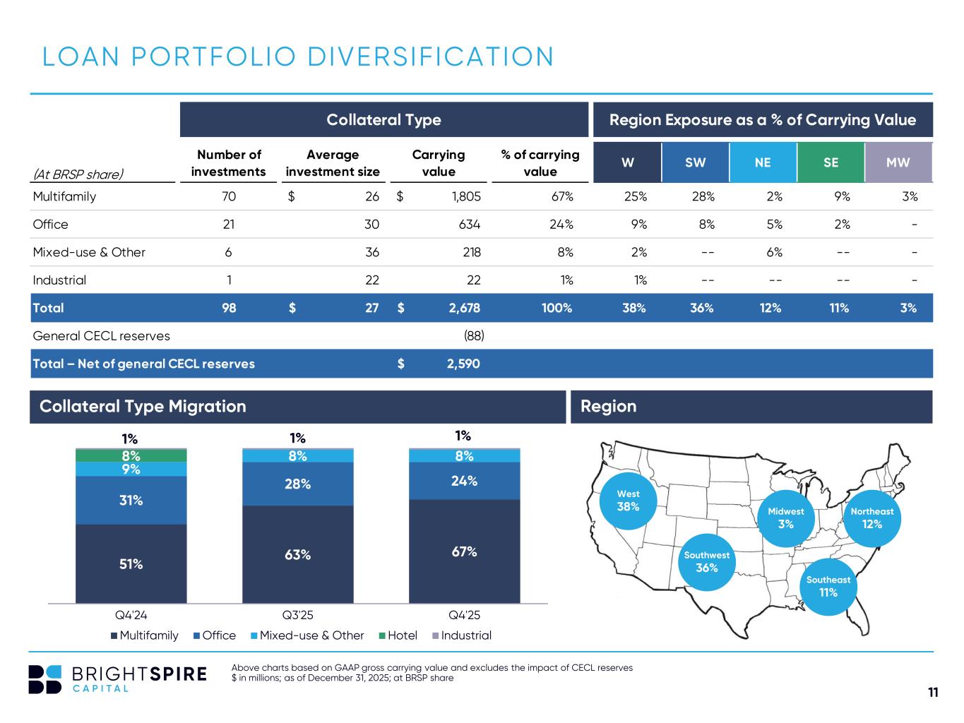 10 $2,363 $2,678$398 $11 ($40) ($53) 9/30/2025 Loan Portfolio Total New Loans Additional Loan Fundings Repayments Other 12/31/2025 Loan Portfolio <$25M 29% $25M-$50M 51% $51M-$75M 17% >$75M 3% Above charts based on GAAP gross carrying value and excludes the impact of CECL reserves $ in millions, unless otherwise stated; as of December 31, 2025, unless otherwise stated; at BRSP share See footnotes in the appendix LOAN PORTFOLIO OVERVIEW 98% 2% <1% Senior mortgage loans Mezzanine loans Preferred equity Overview Investment Type Property Type 98 Total number of investments $2.7B Total loan portfolio $27M Average investment size 0.9 yrs. W.A. remaining term(12) 2.0 yrs. W.A. extended remaining term(13) 7.3% W.A. unlevered all-in yield(1) 3.1 W.A. risk ranking 99% of senior loans are floating rate 67% 24% 8%1% Multifamily Office Mixed-use & Other Industrial Loan Portfolio Activity (16) (15) (14)(Initial Fundings) Loan Size Diversification Total Loan Count 98Total Loan Count 85