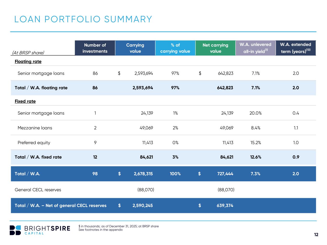 11 Collateral Type Region Exposure as a % of Carrying Value (At BRSP share) Number of investments Average investment size Carrying value % of carrying value W SW NE SE MW Multifamily 70 26$ 1,805$ 67% 25% 28% 2% 9% 3% Office 21 30 634 24% 9% 8% 5% 2% - Mixed-use & Other 6 36 218 8% 2% -- 6% -- - Industrial 1 22 22 1% 1% -- -- -- - Total 98 27$ 2,678$ 100% 38% 36% 12% 11% 3% General CECL reserves (88) Total – Net of general CECL reserves 2,590$ Above charts based on GAAP gross carrying value and excludes the impact of CECL reserves $ in millions; as of December 31, 2025; at BRSP share LOAN PORTFOLIO DIVERSIFICATION Northeast 12% Region Southeast 11% Southwest 36% West 38% Midwest 3% Collateral Type Migration 51% 63% 67% 31% 28% 24% 9% 8% 8%8% 1% 1% 1% Q4'24 Q3'25 Q4'25 Multifamily Office Mixed-use & Other Hotel Industrial