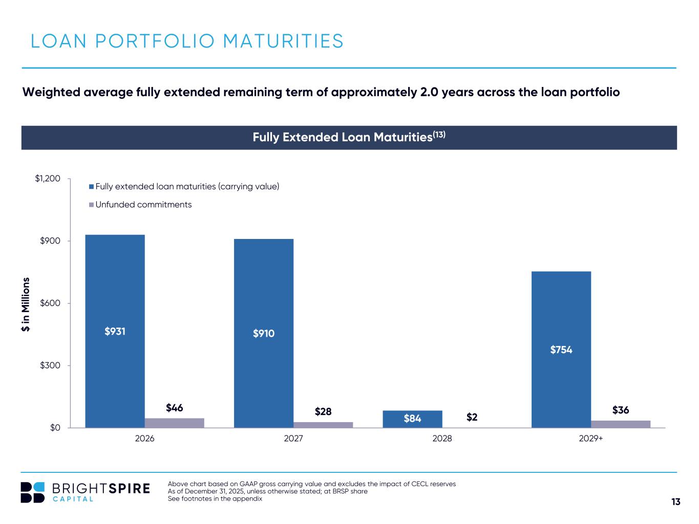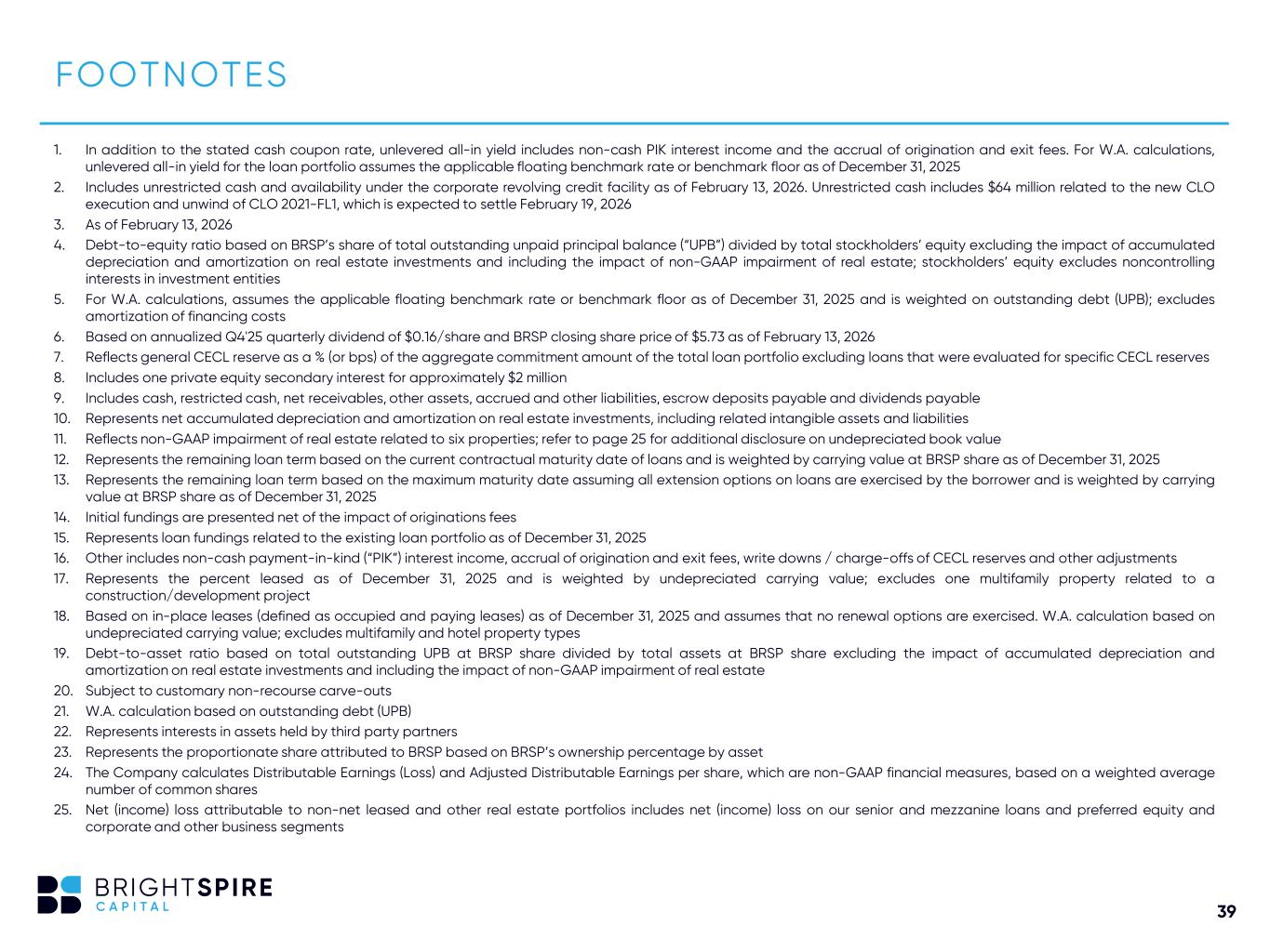 39 1. In addition to the stated cash coupon rate, unlevered all-in yield includes non-cash PIK interest income and the accrual of origination and exit fees. For W.A. calculations, unlevered all-in yield for the loan portfolio assumes the applicable floating benchmark rate or benchmark floor as of December 31, 2025 2. Includes unrestricted cash and availability under the corporate revolving credit facility as of February 13, 2026. Unrestricted cash includes $64 million related to the new CLO execution and unwind of CLO 2021-FL1, which is expected to settle February 19, 2026 3. As of February 13, 2026 4. Debt-to-equity ratio based on BRSP’s share of total outstanding unpaid principal balance (“UPB”) divided by total stockholders’ equity excluding the impact of accumulated depreciation and amortization on real estate investments and including the impact of non-GAAP impairment of real estate; stockholders’ equity excludes noncontrolling interests in investment entities 5. For W.A. calculations, assumes the applicable floating benchmark rate or benchmark floor as of December 31, 2025 and is weighted on outstanding debt (UPB); excludes amortization of financing costs 6. Based on annualized Q4'25 quarterly dividend of $0.16/share and BRSP closing share price of $5.73 as of February 13, 2026 7. Reflects general CECL reserve as a % (or bps) of the aggregate commitment amount of the total loan portfolio excluding loans that were evaluated for specific CECL reserves 8. Includes one private equity secondary interest for approximately $2 million 9. Includes cash, restricted cash, net receivables, other assets, accrued and other liabilities, escrow deposits payable and dividends payable 10. Represents net accumulated depreciation and amortization on real estate investments, including related intangible assets and liabilities 11. Reflects non-GAAP impairment of real estate related to six properties; refer to page 25 for additional disclosure on undepreciated book value 12. Represents the remaining loan term based on the current contractual maturity date of loans and is weighted by carrying value at BRSP share as of December 31, 2025 13. Represents the remaining loan term based on the maximum maturity date assuming all extension options on loans are exercised by the borrower and is weighted by carrying value at BRSP share as of December 31, 2025 14. Initial fundings are presented net of the impact of originations fees 15. Represents loan fundings related to the existing loan portfolio as of December 31, 2025 16. Other includes non-cash payment-in-kind (“PIK”) interest income, accrual of origination and exit fees, write downs / charge-offs of CECL reserves and other adjustments 17. Represents the percent leased as of December 31, 2025 and is weighted by undepreciated carrying value; excludes one multifamily property related to a construction/development project 18. Based on in-place leases (defined as occupied and paying leases) as of December 31, 2025 and assumes that no renewal options are exercised. W.A. calculation based on undepreciated carrying value; excludes multifamily and hotel property types 19. Debt-to-asset ratio based on total outstanding UPB at BRSP share divided by total assets at BRSP share excluding the impact of accumulated depreciation and amortization on real estate investments and including the impact of non-GAAP impairment of real estate 20. Subject to customary non-recourse carve-outs 21. W.A. calculation based on outstanding debt (UPB) 22. Represents interests in assets held by third party partners 23. Represents the proportionate share attributed to BRSP based on BRSP’s ownership percentage by asset 24. The Company calculates Distributable Earnings (Loss) and Adjusted Distributable Earnings per share, which are non-GAAP financial measures, based on a weighted average number of common shares 25. Net (income) loss attributable to non-net leased and other real estate portfolios includes net (income) loss on our senior and mezzanine loans and preferred equity and corporate and other business segments FOOTNOTES