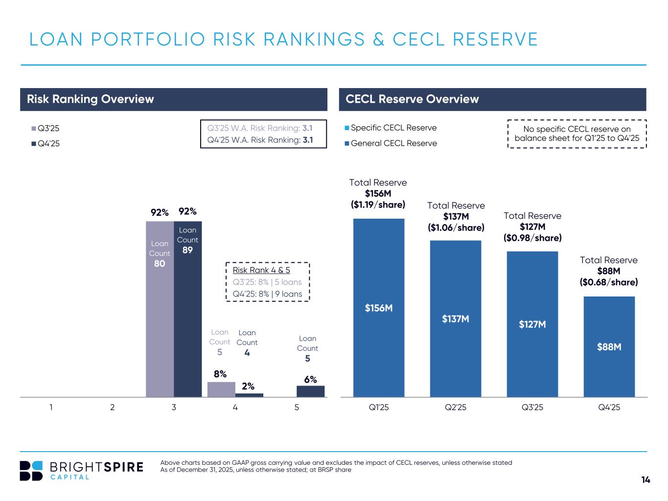 13 LOAN PORTFOLIO MATURITIES Fully Extended Loan Maturities(13) $931 $910 $84 $754 $46 $28 $2 $36 $0 $300 $600 $900 $1,200 2026 2027 2028 2029+ Fully extended loan maturities (carrying value) Unfunded commitments $ in M ill io ns Weighted average fully extended remaining term of approximately 2.0 years across the loan portfolio Above chart based on GAAP gross carrying value and excludes the impact of CECL reserves As of December 31, 2025, unless otherwise stated; at BRSP share See footnotes in the appendix