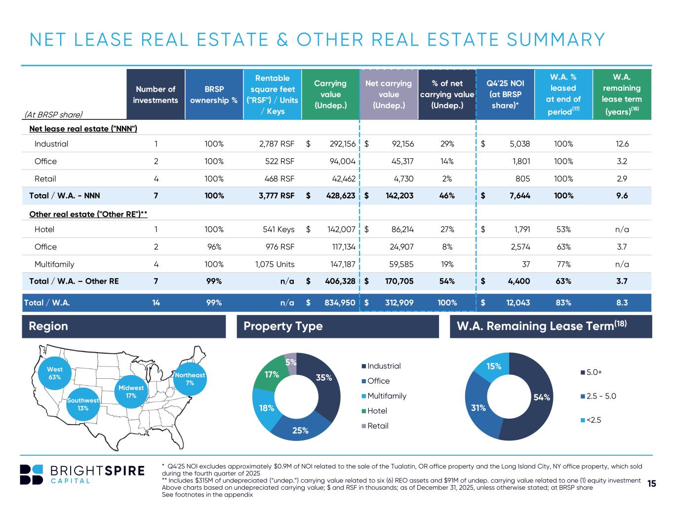 15 (At BRSP share) Number of investments BRSP ownership % Rentable square feet ("RSF") / Units / Keys Carrying value (Undep.) Net carrying value (Undep.) % of net carrying value (Undep.) Q4'25 NOI (at BRSP share)* W.A. % leased at end of period(17) W.A. remaining lease term (years)(18) Net lease real estate ("NNN") Industrial 1 100% 2,787 RSF 292,156$ 92,156$ 29% 5,038$ 100% 12.6 Office 2 100% 522 RSF 94,004 45,317 14% 1,801 100% 3.2 Retail 4 100% 468 RSF 42,462 4,730 2% 805 100% 2.9 Total / W.A. - NNN 7 100% 3,777 RSF 428,623$ 142,203$ 46% 7,644$ 100% 9.6 Other real estate ("Other RE")** Hotel 1 100% 541 Keys 142,007$ 86,214$ 27% 1,791$ 53% n/a Office 2 96% 976 RSF 117,134 24,907 8% 2,574 63% 3.7 Multifamily 4 100% 1,075 Units 147,187 59,585 19% 37 77% n/a Total / W.A. – Other RE 7 99% n/a 406,328$ 170,705$ 54% 4,400$ 63% 3.7 Total / W.A. 14 99% n/a 834,950$ 312,909$ 100% 12,043$ 83% 8.3 35% 25% 18% 17% 5% Industrial Office Multifamily Hotel Retail NET LEASE REAL ESTATE & OTHER REAL ESTATE SUMMARY 54% 31% 15% 5.0+ 2.5 - 5.0 <2.5 Region Property Type W.A. Remaining Lease Term(18) West 63% Northeast 7% Midwest 17% Southwest 13% * Q4'25 NOI excludes approximately $0.9M of NOI related to the sale of the Tualatin, OR office property and the Long Island City, NY office property, which sold during the fourth quarter of 2025 ** Includes $315M of undepreciated (“undep.”) carrying value related to six (6) REO assets and $91M of undep. carrying value related to one (1) equity investment Above charts based on undepreciated carrying value; $ and RSF in thousands; as of December 31, 2025, unless otherwise stated; at BRSP share See footnotes in the appendix