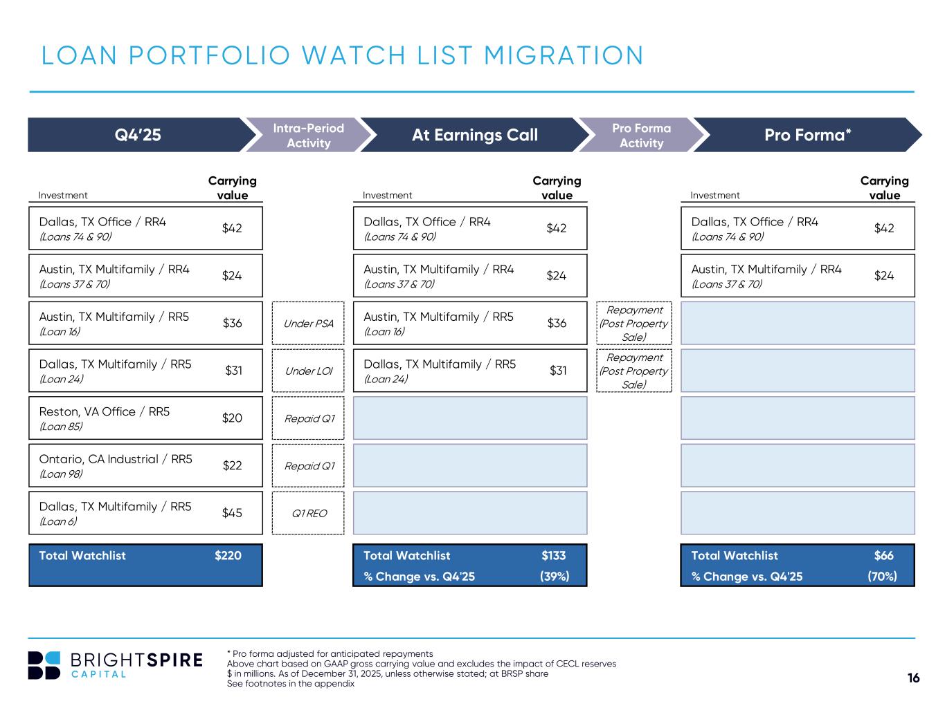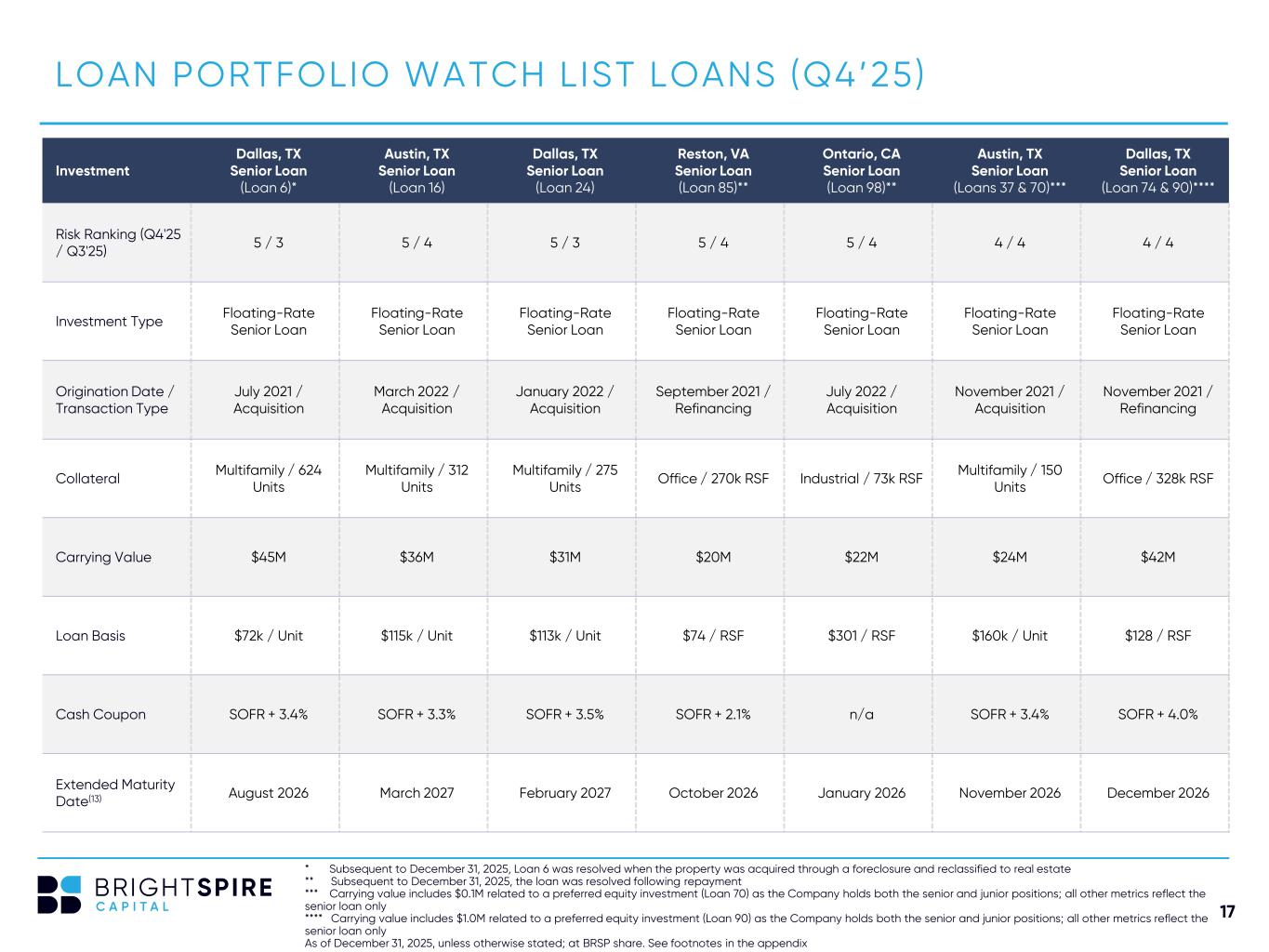 16 Carrying Carrying Carrying Investment value Investment value Investment value Dallas, TX Office / RR4 (Loans 74 & 90) $42 Dallas, TX Office / RR4 (Loans 74 & 90) $42 Dallas, TX Office / RR4 (Loans 74 & 90) $42 Austin, TX Multifamily / RR4 (Loans 37 & 70) $24 Austin, TX Multifamily / RR4 (Loans 37 & 70) $24 Austin, TX Multifamily / RR4 (Loans 37 & 70) $24 Austin, TX Multifamily / RR5 (Loan 16) $36 Under PSA Austin, TX Multifamily / RR5 (Loan 16) $36 Repayment (Post Property Sale) Dallas, TX Multifamily / RR5 (Loan 24) $31 Under LOI Dallas, TX Multifamily / RR5 (Loan 24) $31 Repayment (Post Property Sale) Reston, VA Office / RR5 (Loan 85) $20 Repaid Q1 Ontario, CA Industrial / RR5 (Loan 98) $22 Repaid Q1 Dallas, TX Multifamily / RR5 (Loan 6) $45 Q1 REO Total Watchlist $220 Total Watchlist $133 Total Watchlist $66 % Change vs. Q4'25 (39%) % Change vs. Q4'25 (70%) LOAN PORTFOLIO WATCH LIST MIGRATION * Pro forma adjusted for anticipated repayments Above chart based on GAAP gross carrying value and excludes the impact of CECL reserves $ in millions. As of December 31, 2025, unless otherwise stated; at BRSP share See footnotes in the appendix Q4’25 At Earnings Call Pro Forma*Pro Forma Activity Intra-Period Activity
