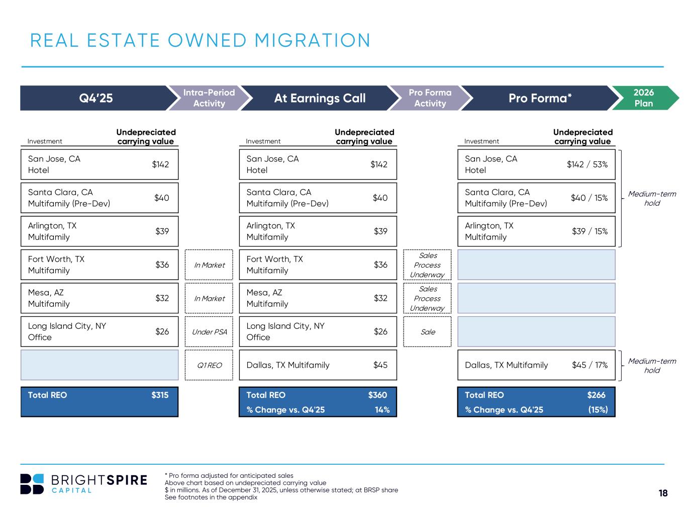 17 LOAN PORTFOLIO WATCH LIST LOANS (Q4’25) * Subsequent to December 31, 2025, Loan 6 was resolved when the property was acquired through a foreclosure and reclassified to real estate ** Subsequent to December 31, 2025, the loan was resolved following repayment *** Carrying value includes $0.1M related to a preferred equity investment (Loan 70) as the Company holds both the senior and junior positions; all other metrics reflect the senior loan only **** Carrying value includes $1.0M related to a preferred equity investment (Loan 90) as the Company holds both the senior and junior positions; all other metrics reflect the senior loan only As of December 31, 2025, unless otherwise stated; at BRSP share. See footnotes in the appendix Investment Dallas, TX Senior Loan (Loan 6)* Austin, TX Senior Loan (Loan 16) Dallas, TX Senior Loan (Loan 24) Reston, VA Senior Loan (Loan 85)** Ontario, CA Senior Loan (Loan 98)** Austin, TX Senior Loan (Loans 37 & 70)*** Dallas, TX Senior Loan (Loan 74 & 90)**** Risk Ranking (Q4'25 / Q3'25) 5 / 3 5 / 4 5 / 3 5 / 4 5 / 4 4 / 4 4 / 4 Investment Type Floating-Rate Senior Loan Floating-Rate Senior Loan Floating-Rate Senior Loan Floating-Rate Senior Loan Floating-Rate Senior Loan Floating-Rate Senior Loan Floating-Rate Senior Loan Origination Date / Transaction Type July 2021 / Acquisition March 2022 / Acquisition January 2022 / Acquisition September 2021 / Refinancing July 2022 / Acquisition November 2021 / Acquisition November 2021 / Refinancing Collateral Multifamily / 624 Units Multifamily / 312 Units Multifamily / 275 Units Office / 270k RSF Industrial / 73k RSF Multifamily / 150 Units Office / 328k RSF Carrying Value $45M $36M $31M $20M $22M $24M $42M Loan Basis $72k / Unit $115k / Unit $113k / Unit $74 / RSF $301 / RSF $160k / Unit $128 / RSF Cash Coupon SOFR + 3.4% SOFR + 3.3% SOFR + 3.5% SOFR + 2.1% n/a SOFR + 3.4% SOFR + 4.0% Extended Maturity Date(13) August 2026 March 2027 February 2027 October 2026 January 2026 November 2026 December 2026