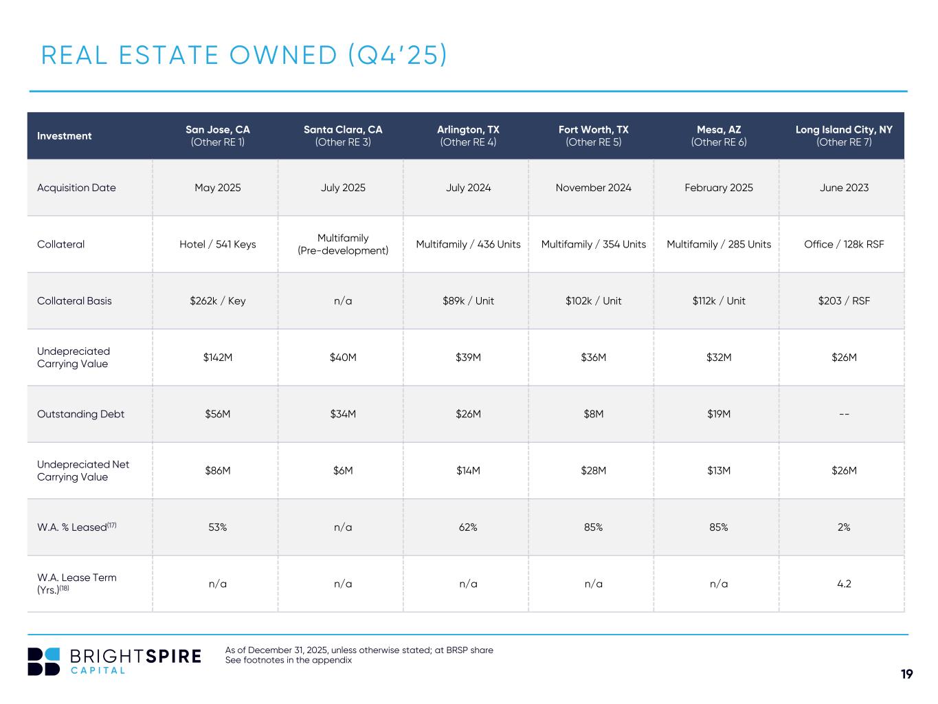 18 Undepreciated Undepreciated Undepreciated Investment carrying value Investment carrying value Investment carrying value San Jose, CA Hotel $142 San Jose, CA Hotel $142 San Jose, CA Hotel $142 / 53% Santa Clara, CA Multifamily (Pre-Dev) $40 Santa Clara, CA Multifamily (Pre-Dev) $40 Santa Clara, CA Multifamily (Pre-Dev) $40 / 15% Arlington, TX Multifamily $39 Arlington, TX Multifamily $39 Arlington, TX Multifamily $39 / 15% Fort Worth, TX Multifamily $36 In Market Fort Worth, TX Multifamily $36 Sales Process Underway Mesa, AZ Multifamily $32 In Market Mesa, AZ Multifamily $32 Sales Process Underway Long Island City, NY Office $26 Under PSA Long Island City, NY Office $26 Sale Q1 REO Dallas, TX Multifamily $45 Dallas, TX Multifamily $45 / 17% Total REO $315 Total REO $360 Total REO $266 % Change vs. Q4'25 14% % Change vs. Q4'25 (15%) REAL ESTATE OWNED MIGRATION * Pro forma adjusted for anticipated sales Above chart based on undepreciated carrying value $ in millions. As of December 31, 2025, unless otherwise stated; at BRSP share See footnotes in the appendix Q4’25 At Earnings Call Pro Forma*Pro Forma Activity Intra-Period Activity Medium-term hold Medium-term hold 2026 Plan