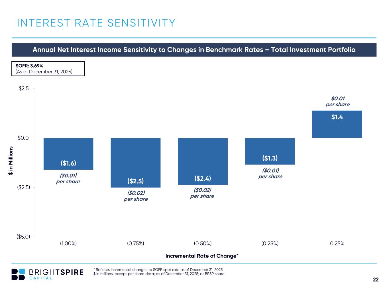 22 ($1.6) ($2.5) ($2.4) ($1.3) $1.4 ($5.0) ($2.5) $0.0 $2.5 (1.00%) (0.75%) (0.50%) (0.25%) 0.25% * Reflects incremental changes to SOFR spot rate as of December 31, 2025 $ in millions, except per share data; as of December 31, 2025; at BRSP share INTEREST RATE SENSITIVITY Annual Net Interest Income Sensitivity to Changes in Benchmark Rates – Total Investment Portfolio $ in M ill io ns SOFR: 3.69% (As of December 31, 2025) Incremental Rate of Change* ($0.02) per share ($0.01) per share $0.01 per share ($0.02) per share ($0.01) per share