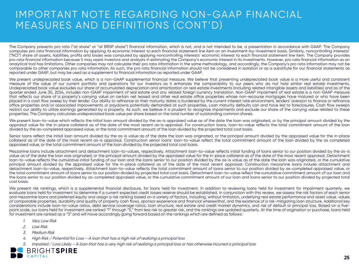 25 The Company presents pro rata (“at share” or “at BRSP share”) financial information, which is not, and is not intended to be, a presentation in accordance with GAAP. The Company computes pro rata financial information by applying its economic interest to each financial statement line item on an investment-by-investment basis. Similarly, noncontrolling interests’ (“NCI”) share of assets, liabilities, profits and losses was computed by applying noncontrolling interests’ economic interest to each financial statement line item. The Company provides pro rata financial information because it may assist investors and analysts in estimating the Company’s economic interest in its investments. However, pro rata financial information as an analytical tool has limitations. Other companies may not calculate their pro rata information in the same methodology, and accordingly, the Company’s pro rata information may not be comparable to other companies pro rata information. As such, the pro rata financial information should not be considered in isolation or as a substitute for our financial statements as reported under GAAP, but may be used as a supplement to financial information as reported under GAAP. We present undepreciated book value, which is a non-GAAP supplemental financial measure. We believe that presenting undepreciated book value is a more useful and consistent measure of the value of our current portfolio and operations for our investors as it enhances the comparability to our peers who do not hold similar real estate investments. Undepreciated book value excludes our share of accumulated depreciation and amortization on real estate investments (including related intangible assets and liabilities) and as of the quarter ended June 30, 2024, includes non-GAAP impairment of real estate and any related foreign currency translation. Non-GAAP impairment of real estate is a non-GAAP measure that reflects our share of a property’s carrying value on certain net leased and other real estate office properties whose non-recourse mortgages have matured or who have been placed in a cash flow sweep by their lender. Our ability to refinance at their maturity dates is burdened by the current interest rate environment, lenders’ aversion to finance or refinance office properties and/or associated improvements or paydowns potentially demanded at such properties. Loan maturity defaults can and have led to foreclosures. Cash flow sweeps restrict our ability to utilize earnings generated by a property. As such, we believe it is prudent to recognize impairments and exclude our share of the carrying value related to these properties. The Company calculates undepreciated book value per share based on the total number of outstanding common shares. We present loan-to-value which reflects the initial loan amount divided by the as-is appraised value as of the date the loan was originated, or by the principal amount divided by the appraisal value for the in-place collateral as of the date of the most recent as-is appraisal. For construction loans, loan-to-value reflects the total commitment amount of the loan divided by the as-completed appraised value, or the total commitment amount of the loan divided by the projected total cost basis. Senior loans reflect the initial loan amount divided by the as-is value as of the date the loan was originated, or the principal amount divided by the appraised value for the in-place collateral as of the date of the most recent as-is appraisal. Construction senior loans’ loan-to-value reflect the total commitment amount of the loan divided by the as completed appraised value, or the total commitment amount of the loan divided by the projected total cost basis. Mezzanine loans include attachment and detachment loan-to-values, respectively. Attachment loan-to-value reflects initial funding of loans senior to our position divided by the as-is value as of the date the loan was originated, or the principal amount divided by the appraised value for the in-place collateral as of the date of the most recent appraisal. Detachment loan-to-value reflects the cumulative initial funding of our loan and the loans senior to our position divided by the as-is value as of the date the loan was originated, or the cumulative principal amount divided by the appraised value for the in-place collateral as of the date of the most recent appraisal. Construction mezzanine loans include attachment and detachment loan-to-value, respectively. Attachment loan-to-value reflects the total commitment amount of loans senior to our position divided by as-completed appraised value, or the total commitment amount of loans senior to our position divided by projected total cost basis. Detachment loan-to-value reflect the cumulative commitment amount of our loan and the loans senior to our position divided by as-completed appraised value, or the cumulative commitment amount of our loan and loans senior to our position divided by projected total cost basis. We present risk rankings, which is a supplemental financial disclosure, for loans held for investment. In addition to reviewing loans held for investment for impairment quarterly, we evaluate loans held for investment to determine if a current expected credit losses reserve should be established. In conjunction with this review, we assess the risk factors of each senior and mezzanine loans and preferred equity and assign a risk ranking based on a variety of factors, including, without limitation, underlying real estate performance and asset value, values of comparable properties, durability and quality of property cash flows, sponsor experience and financial wherewithal, and the existence of a risk-mitigating loan structure. Additional key considerations include loan-to-value ratios, debt service coverage ratios, loan structure, real estate and credit market dynamics, and risk of default or principal loss. Based on a five- point scale, our loan