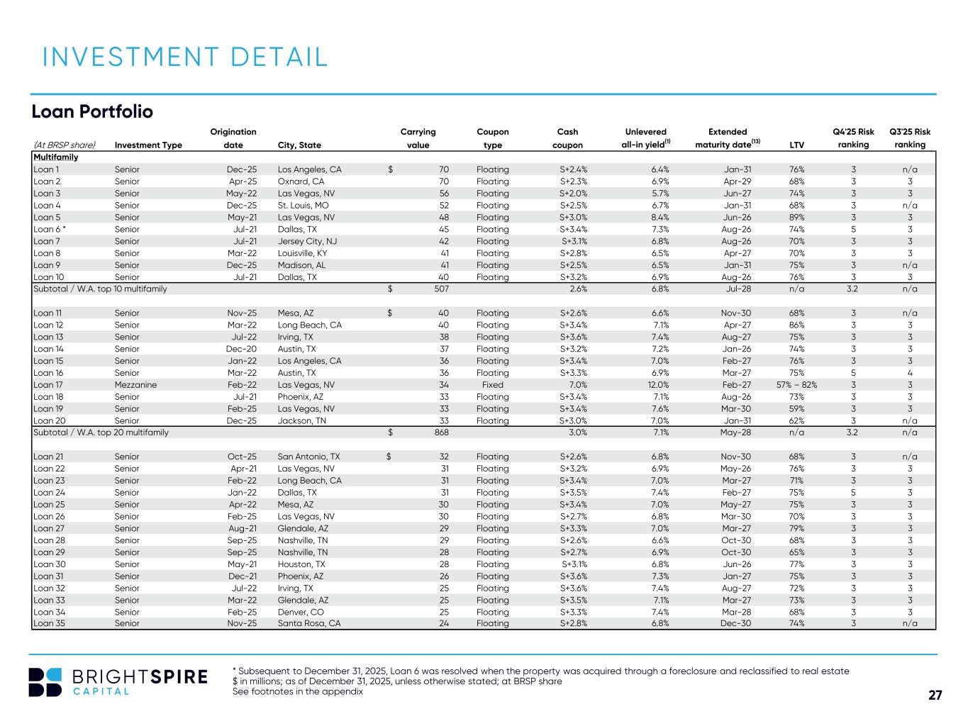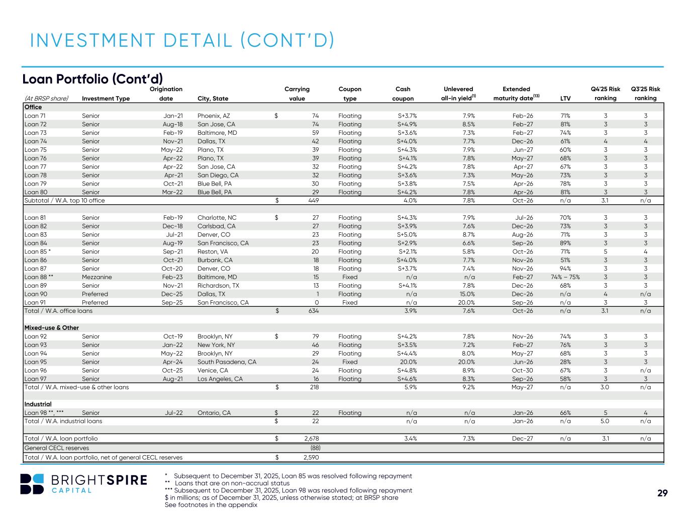 28 Origination Carrying Coupon Cash Unlevered Extended Q4'25 Risk Q3'25 Risk (At BRSP share) Investment Type date City, State value type coupon all-in yield(1) maturity date(13) LTV ranking ranking Loan 36 Senior Mar-22 Phoenix, AZ 24 Floating S+3.7% 7.3% Apr-27 74% 3 3 Loan 37 Senior Nov-21 Austin, TX 24 Floating S+3.4% 7.1% Nov-26 78% 4 4 Loan 38 Senior Dec-24 Seattle, WA 23 Floating S+2.8% 6.9% Jan-30 65% 3 3 Loan 39 Senior Jan-25 Lebanon, TN 22 Floating S+3.4% 8.0% Feb-30 71% 3 3 Loan 40 Senior Jun-21 Phoenix, AZ 22 Floating S+3.3% 7.0% Jul-26 71% 3 3 Loan 41 Senior Jul-21 Aurora, CO 21 Floating S+3.2% 7.0% Jul-26 89% 3 3 Loan 42 Senior Dec-25 Minneapolis, MN 21 Floating S+2.5% 6.7% Jan-31 65% 3 n/a Loan 43 Senior Aug-25 Dallas, TX 21 Floating S+3.0% 7.1% Sep-30 59% 3 3 Loan 44 Senior Jan-22 Austin, TX 20 Floating S+3.4% 7.0% Feb-27 76% 3 3 Loan 45 Senior Dec-21 Gresham, OR 20 Floating S+2.8% 6.4% Jul-28 76% 3 3 Loan 46 Senior Aug-21 La Mesa, CA 20 Floating S+2.8% 6.4% Aug-28 72% 3 3 Loan 47 Senior Oct-24 Garland, TX 20 Floating S+3.7% 7.7% Nov-29 70% 3 3 Loan 48 Senior Sep-21 Bellevue, WA 19 Floating S+3.4% 7.1% Sep-26 75% 3 3 Loan 49 Senior Jul-21 Salt Lake City, UT 19 Floating S+2.8% 6.4% Aug-28 67% 3 3 Loan 50 Senior Apr-22 Tacoma, WA 19 Floating S+3.0% 6.6% May-27 64% 3 3 Loan 51 Senior May-22 Charlotte, NC 18 Floating S+3.5% 7.2% May-27 68% 3 3 Loan 52 Senior Jun-21 Phoenix, AZ 18 Floating S+3.2% 6.9% Jul-26 77% 3 3 Loan 53 Senior Nov-25 Los Angeles, CA 18 Floating S+2.5% 6.7% Dec-30 59% 3 n/a Loan 54 Senior Oct-25 Huntsville, AL 18 Floating S+2.8% 7.0% Nov-30 55% 3 n/a Loan 55 Senior Sep-25 Glendale, AZ 17 Floating S+2.6% 6.6% Oct-30 71% 3 3 Loan 56 Senior May-25 Dallas, TX 14 Floating S+2.9% 7.1% May-30 65% 3 3 Loan 57 Senior Aug-25 Phoenix, AZ 14 Floating S+2.7% 6.7% Sep-30 75% 3 3 Loan 58 Senior Jul-25 Northridge, CA 13 Floating S+3.3% 7.4% Jul-30 74% 3 3 Loan 59 Senior Sep-25 Mobile, AL 13 Floating S+2.8% 6.8% Oct-30 73% 3 3 Loan 60 Senior Nov-25 Hoboken, NJ 12 Floating S+2.4% 6.6% Dec-30 61% 3 n/a Loan 61 Senior Nov-24 Garland, TX 12 Floating S+3.5% 7.5% Dec-29 63% 3 3 Loan 62 Senior Mar-22 Glendale, AZ 12 Floating S+3.5% 7.1% Mar-27 73% 3 3 Loan 63 Senior Dec-25 Mesa, AZ 11 Floating S+2.8% 6.8% Jan-31 70% 3 n/a Loan 64 Preferred May-25 Mesa, AZ 2 Fixed n/a 15.0% May-27 n/a 3 3 Loan 65 Preferred May-25 Phoenix, AZ 2 Fixed n/a 15.0% Apr-27 n/a 3 3 Loan 66 Preferred May-25 Phoenix, AZ 2 Fixed n/a 15.0% Jan-27 n/a 3 3 Loan 67 Preferred May-25 Phoenix, AZ 2 Fixed n/a 15.0% Aug-26 n/a 3 3 Loan 68 Preferred May-25 Glendale, AZ 2 Fixed n/a 15.0% Mar-27 n/a 3 3 Loan 69 Preferred May-25 Phoenix, AZ 1 Fixed n/a 15.0% Jul-26 n/a 3 3 Loan 70 Preferred Dec-25 Austin, TX 0 Fixed n/a 15.0% Nov-26 n/a 4 n/a Total / W.A. multifamily loans 1,805$ 3.0% 7.1% Jun-28 n/a 3.1 n/a Loan Portfolio (Cont’d) INVESTMENT DETAIL (CONT’D) $ in millions; as of December 31, 2025, unless otherwise stated; at BRSP share See footnotes in the appendix