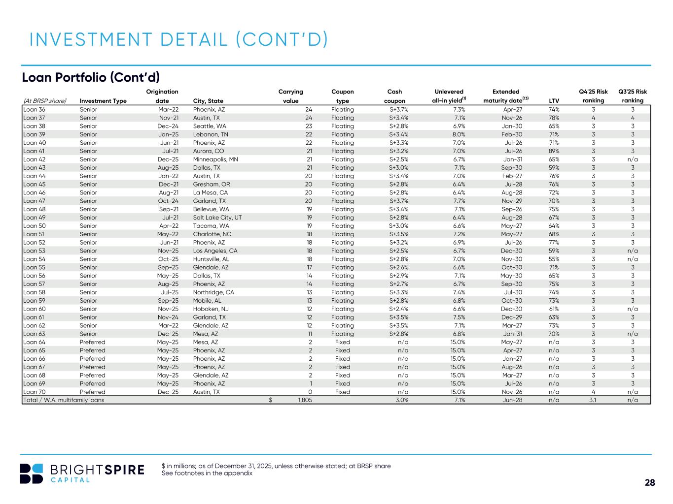 27 INVESTMENT DETAIL * Subsequent to December 31, 2025, Loan 6 was resolved when the property was acquired through a foreclosure and reclassified to real estate $ in millions; as of December 31, 2025, unless otherwise stated; at BRSP share See footnotes in the appendix Loan Portfolio Origination Carrying Coupon Cash Unlevered Extended Q4'25 Risk Q3'25 Risk (At BRSP share) Investment Type date City, State value type coupon all-in yield(1) maturity date(13) LTV ranking ranking Multifamily Loan 1 Senior Dec-25 Los Angeles, CA 70$ Floating S+2.4% 6.4% Jan-31 76% 3 n/a Loan 2 Senior Apr-25 Oxnard, CA 70 Floating S+2.3% 6.9% Apr-29 68% 3 3 Loan 3 Senior May-22 Las Vegas, NV 56 Floating S+2.0% 5.7% Jun-27 74% 3 3 Loan 4 Senior Dec-25 St. Louis, MO 52 Floating S+2.5% 6.7% Jan-31 68% 3 n/a Loan 5 Senior May-21 Las Vegas, NV 48 Floating S+3.0% 8.4% Jun-26 89% 3 3 Loan 6 * Senior Jul-21 Dallas, TX 45 Floating S+3.4% 7.3% Aug-26 74% 5 3 Loan 7 Senior Jul-21 Jersey City, NJ 42 Floating S+3.1% 6.8% Aug-26 70% 3 3 Loan 8 Senior Mar-22 Louisville, KY 41 Floating S+2.8% 6.5% Apr-27 70% 3 3 Loan 9 Senior Dec-25 Madison, AL 41 Floating S+2.5% 6.5% Jan-31 75% 3 n/a Loan 10 Senior Jul-21 Dallas, TX 40 Floating S+3.2% 6.9% Aug-26 76% 3 3 Subtotal / W.A. top 10 multifamily 507$ 2.6% 6.8% Jul-28 n/a 3.2 n/a Loan 11 Senior Nov-25 Mesa, AZ 40$ Floating S+2.6% 6.6% Nov-30 68% 3 n/a Loan 12 Senior Mar-22 Long Beach, CA 40 Floating S+3.4% 7.1% Apr-27 86% 3 3 Loan 13 Senior Jul-22 Irving, TX 38 Floating S+3.6% 7.4% Aug-27 75% 3 3 Loan 14 Senior Dec-20 Austin, TX 37 Floating S+3.2% 7.2% Jan-26 74% 3 3 Loan 15 Senior Jan-22 Los Angeles, CA 36 Floating S+3.4% 7.0% Feb-27 76% 3 3 Loan 16 Senior Mar-22 Austin, TX 36 Floating S+3.3% 6.9% Mar-27 75% 5 4 Loan 17 Mezzanine Feb-22 Las Vegas, NV 34 Fixed 7.0% 12.0% Feb-27 57% – 82% 3 3 Loan 18 Senior Jul-21 Phoenix, AZ 33 Floating S+3.4% 7.1% Aug-26 73% 3 3 Loan 19 Senior Feb-25 Las Vegas, NV 33 Floating S+3.4% 7.6% Mar-30 59% 3 3 Loan 20 Senior Dec-25 Jackson, TN 33 Floating S+3.0% 7.0% Jan-31 62% 3 n/a Subtotal / W.A. top 20 multifamily 868$ 3.0% 7.1% May-28 n/a 3.2 n/a Loan 21 Senior Oct-25 San Antonio, TX 32$ Floating S+2.6% 6.8% Nov-30 68% 3 n/a Loan 22 Senior Apr-21 Las Vegas, NV 31 Floating S+3.2% 6.9% May-26 76% 3 3 Loan 23 Senior Feb-22 Long Beach, CA 31 Floating S+3.4% 7.0% Mar-27 71% 3 3 Loan 24 Senior Jan-22 Dallas, TX 31 Floating S+3.5% 7.4% Feb-27 75% 5 3 Loan 25 Senior Apr-22 Mesa, AZ 30 Floating S+3.4% 7.0% May-27 75% 3 3 Loan 26 Senior Feb-25 Las Vegas, NV 30 Floating S+2.7% 6.8% Mar-30 70% 3 3 Loan 27 Senior Aug-21 Glendale, AZ 29 Floating S+3.3% 7.0% Mar-27 79% 3 3 Loan 28 Senior Sep-25 Nashville, TN 29 Floating S+2.6% 6.6% Oct-30 68% 3 3 Loan 29 Senior Sep-25 Nashville, TN 28 Floating S+2.7% 6.9% Oct-30 65% 3 3 Loan 30 Senior May-21 Houston, TX 28 Floating S+3.1% 6.8% Jun-26 77% 3 3 Loan 31 Senior Dec-21 Phoenix, AZ 26 Floating S+3.6% 7.3% Jan-27 75% 3 3 Loan 32 Senior Jul-22 Irving, TX 25 Floating S+3.6% 7.4% Aug-27 72% 3 3 Loan 33 Senior Mar-22 Glendale, AZ 25 Floating S+3.5% 7.1% Mar-27 73% 3 3 Loan 34 Senior Feb-25 Denver, CO 25 Floating S+3.3% 7.4% Mar-28 68% 3 3 Loan 35 Senior Nov-25 Santa Rosa, CA 24 Floating S+2.8% 6.8% Dec-30 74% 3 n/a