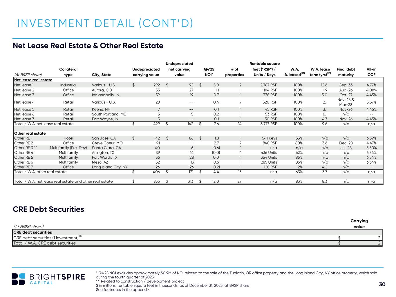 30 Undepreciated Rentable square Collateral Undepreciated net carrying Q4'25 # of feet ("RSF") / W.A. W.A. lease Final debt All-in (At BRSP share) type City, State carrying value value NOI* properties Units / Keys % leased(17) term (yrs)(18) maturity COF Net lease real estate Net lease 1 Industrial Various - U.S. 292$ 92$ 5.0$ 2 2,787 RSF 100% 12.6 Sep-33 4.77% Net lease 2 Office Aurora, CO 55 27 1.1 1 184 RSF 100% 1.9 Aug-26 4.08% Net lease 3 Office Indianapolis, IN 39 19 0.7 1 338 RSF 100% 5.0 Oct-27 4.45% Net lease 4 Retail Various - U.S. 28 -- 0.4 7 320 RSF 100% 2.1 Nov-26 & Mar-28 5.57% Net lease 5 Retail Keene, NH 7 -- 0.1 1 45 RSF 100% 3.1 Nov-26 4.45% Net lease 6 Retail South Portland, ME 5 5 0.2 1 53 RSF 100% 6.1 n/a -- Net lease 7 Retail Fort Wayne, IN 3 -- 0.1 1 50 RSF 100% 4.7 Nov-26 4.45% Total / W.A. net lease real estate 429$ 142$ 7.6$ 14 3,777 RSF 100% 9.6 n/a n/a Other real estate Other RE 1 Hotel San Jose, CA 142$ 86$ 1.8$ 1 541 Keys 53% n/a n/a 6.39% Other RE 2 Office Creve Coeur, MO 91 -- 2.7 7 848 RSF 80% 3.6 Dec-28 4.47% Other RE 3 ** Multifamily (Pre-Dev) Santa Clara, CA 40 6 (0.6) 1 n/a n/a n/a Jul-28 5.50% Other RE 4 Multifamily Arlington, TX 39 14 (0.0) 1 436 Units 62% n/a n/a 6.34% Other RE 5 Multifamily Fort Worth, TX 36 28 0.0 1 354 Units 85% n/a n/a 6.34% Other RE 6 Multifamily Mesa, AZ 32 13 0.6 1 285 Units 85% n/a n/a 6.34% Other RE 7 Office Long Island City, NY 26 26 (0.2) 1 128 RSF 2% 4.2 n/a -- Total / W.A. other real estate 406$ 171$ 4.4$ 13 n/a 63% 3.7 n/a n/a Total / W.A. net lease real estate and other real estate 835$ 313$ 12.0$ 27 n/a 83% 8.3 n/a n/a INVESTMENT DETAIL (CONT’D) CRE Debt Securities * Q4'25 NOI excludes approximately $0.9M of NOI related to the sale of the Tualatin, OR office property and the Long Island City, NY office property, which sold during the fourth quarter of 2025 ** Related to construction / development project $ in millions; rentable square feet in thousands; as of December 31, 2025; at BRSP share See footnotes in the appendix Net Lease Real Estate & Other Real Estate Carrying (At BRSP share) value CRE debt securities CRE debt securities (1 investment)(8) 2$ Total / W.A. CRE debt securities 2$