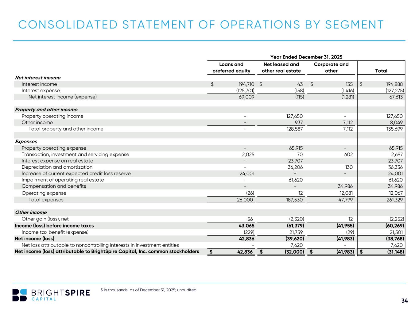 33 $ in thousands; as of December 31, 2025; unaudited CONSOLIDATED STATEMENT OF OPERATIONS BY SEGMENT Three Months Ended December 31, 2025 Loan portfolio Net leased and other real estate Corporate and other Total Net interest income Interest income 49,250$ -$ -$ 49,250$ Interest expense (31,247) (13) (506) (31,766) Net interest income (expense) 18,003 (13) (506) 17,484 Property and other income Property operating income - 32,587 - 32,587 Other income 20 577 729 1,326 Total property and other income 20 33,164 729 33,913 Expenses Property operating expense - 19,622 - 19,622 Transaction, investment and servicing expense 571 (4) 84 651 Interest expense on real estate - 5,207 - 5,207 Depreciation and amortization - 7,957 33 7,990 Increase of current expected credit loss reserve 15,439 - - 15,439 Impairment of operating real estate - 7,984 - 7,984 Compensation and benefits - - 8,287 8,287 Operating expense (15) 9 3,025 3,019 Total expenses 15,995 40,775 11,429 68,199 Other income Other gain, net - 813 - 813 Income (loss) before income taxes 2,028 (6,811) (11,206) (15,989) Income tax expense (10) - - (10) Net income (loss) 2,018 (6,811) (11,206) (15,999) Net loss attributable to noncontrolling interests in investment entities - 1,646 - 1,646 Net income (loss) attributable to BrightSpire Capital, Inc. common stockholders 2,018$ (5,165)$ (11,206)$ (14,353)$