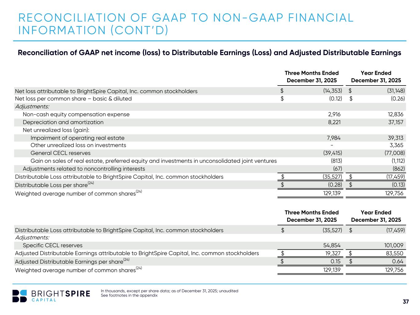 36 RECONCILIATION OF GAAP TO NON-GAAP FINANCIAL INFORMATION (CONT’D) Reconciliation of GAAP net book value to undepreciated book value In thousands, except per share data; as of December 31, 2025; unaudited; per share data may differ due to rounding See footnotes in the appendix As of December 31, 2025 GAAP net book value (excluding noncontrolling interests in investment entities) 938,432$ Accumulated depreciation and amortization(10) 180,937 Non-GAAP impairment of real estate(11) (33,617) Undepreciated book value 1,085,752$ GAAP net book value per share (excluding noncontrolling interests in investment entities) 7.30$ Accumulated depreciation and amortization per share(10) 1.41 Non-GAAP impairment of real estate per share(11) (0.26) Undepreciated book value per share 8.44$ Total common shares 128,627 As of December 31, 2025 Impairment attributable to BrightSpire Capital, Inc. 61,620$ Adjustments: Current year non-GAAP impairment of real estate (100,961) Non-GAAP impairment as of prior fiscal year-end 134,578 Impairment attributable to BrightSpire Capital, Inc. (61,620) Non-GAAP impairment of real estate 33,617$