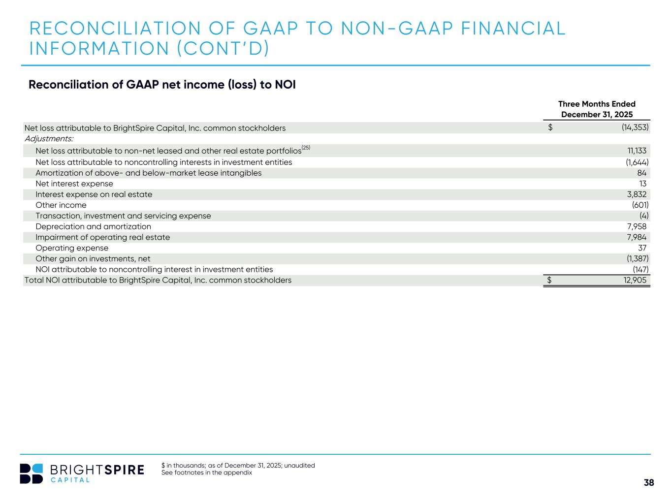 37 Reconciliation of GAAP net income (loss) to Distributable Earnings (Loss) and Adjusted Distributable Earnings In thousands, except per share data; as of December 31, 2025; unaudited See footnotes in the appendix RECONCILIATION OF GAAP TO NON-GAAP FINANCIAL INFORMATION (CONT’D) Three Months Ended December 31, 2025 Year Ended December 31, 2025 Net loss attributable to BrightSpire Capital, Inc. common stockholders (14,353)$ (31,148)$ Net loss per common share – basic & diluted (0.12)$ (0.26)$ Adjustments: Non-cash equity compensation expense 2,916 12,836 Depreciation and amortization 8,221 37,157 Net unrealized loss (gain): Impairment of operating real estate 7,984 39,313 Other unrealized loss on investments - 3,365 General CECL reserves (39,415) (77,008) Gain on sales of real estate, preferred equity and investments in unconsolidated joint ventures (813) (1,112) Adjustments related to noncontrolling interests (67) (862) Distributable Loss attributable to BrightSpire Capital, Inc. common stockholders (35,527)$ (17,459)$ Distributable Loss per share(24) (0.28)$ (0.13)$ Weighted average number of common shares(24) 129,139 129,756 Three Months Ended December 31, 2025 Year Ended December 31, 2025 Distributable Loss attributable to BrightSpire Capital, Inc. common stockholders (35,527)$ (17,459)$ Adjustments: Specific CECL reserves 54,854 101,009 Adjusted Distributable Earnings attributable to BrightSpire Capital, Inc. common stockholders 19,327$ 83,550$ Adjusted Distributable Earnings per share(24) 0.15$ 0.64$ Weighted average number of common shares(24) 129,139 129,756